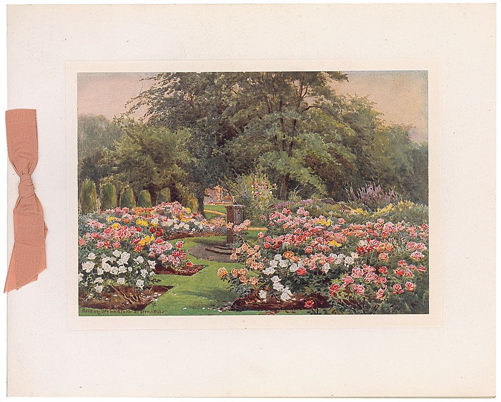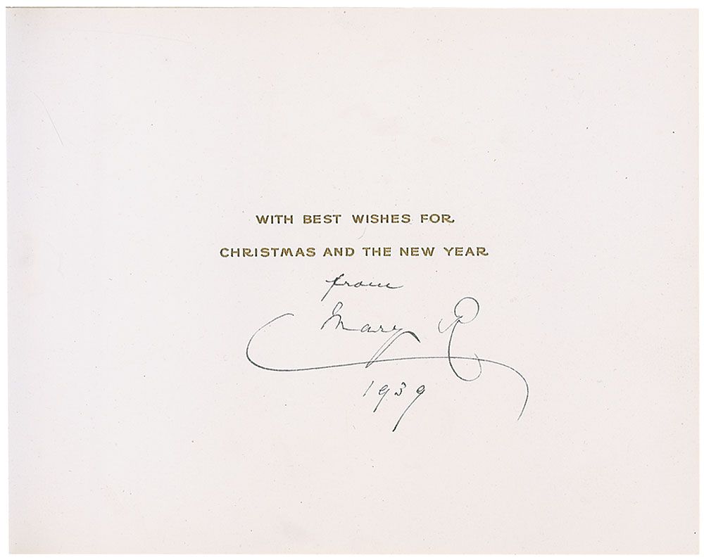Christmas card from 1939, measuring 8.25 x 6.75 closed and featuring an image of a garden on the front, signed inside below a printed Christmas sentiment in black ink, “From Mary R, 1939.” In fine condition. Accompanied by the original mailing envelope, addressed in Mary’s hand.