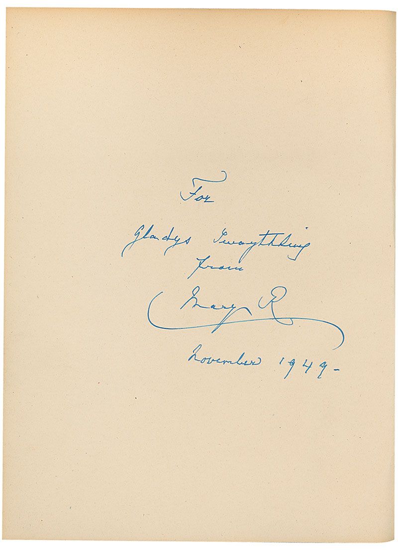 Signed book: Her Majesty Queen Mary. London: Sampson Low, Marston and Co., 1949. Hardcover, 7.5 x 9.75, 192 pages. Signed and inscribed on the reverse of the first free end page, “For Gladys Swaythling from Mary R, November 1949.” In very good condition, with light toning to edges of pages, weak but intact spine, sunning to spine, and wear to covers.