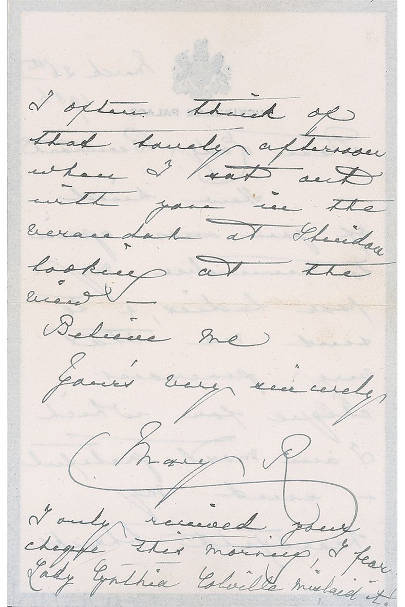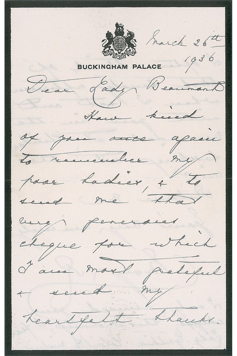 Wife of King George V (1867–1953). ALS signed “Mary R,” 4.75 x 7.25, black-bordered Buckingham Palace mourning stationery, March 26, 1936. Letter to Baroness Lady Beaumont. In part: “How kind of you once again to remember my poor ladies & to send me that very generous cheque…I often think of that lovely afternoon when I sat out with you in the verandah at Sheridan looking at the view.” In very fine condition. Accompanied by the original mailing envelope, filled out in Mary’s hand.