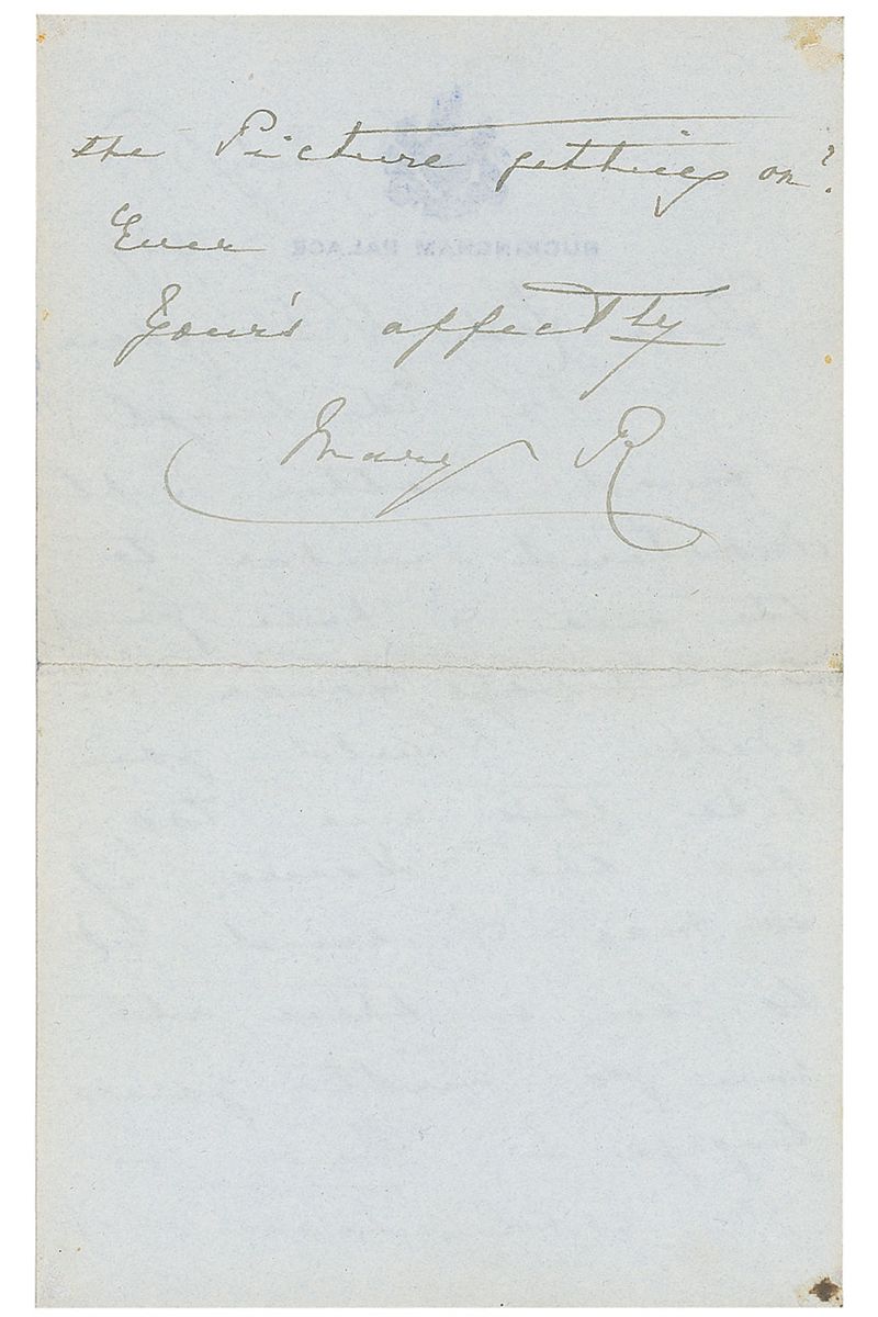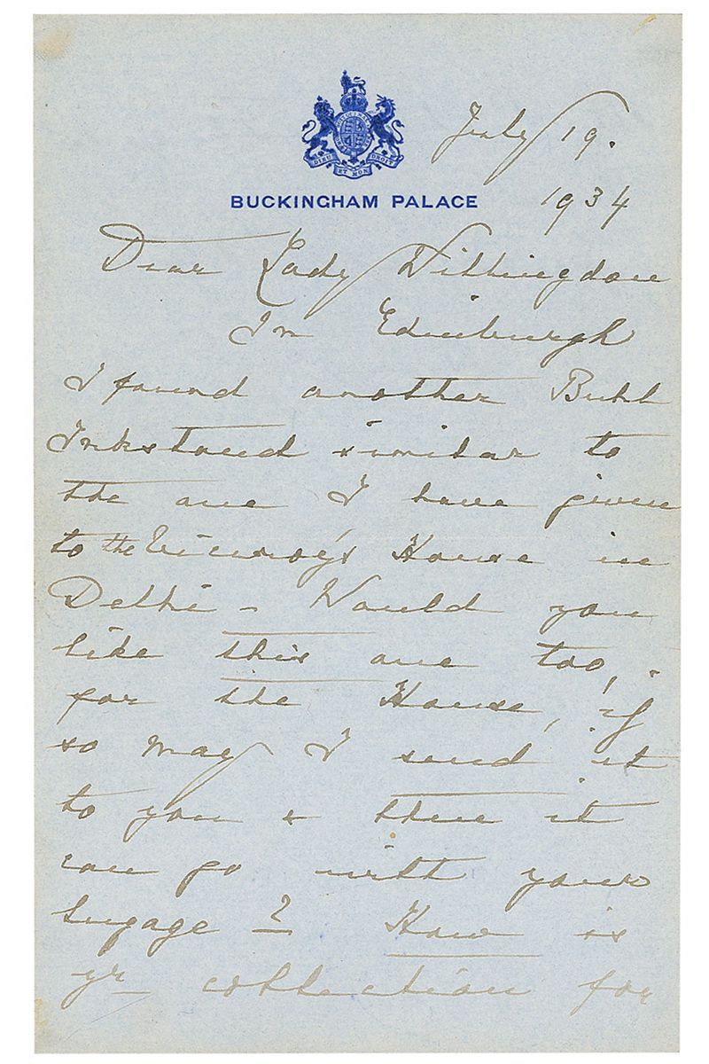ALS signed “Mary R,” one page both sides, 4.5 x 7.25, Buckingham Palace letterhead, July 19, 1934. Letter to Lady Willingdon. In part: “In Edinburgh I found another Bull Inkstand similar to the one I have given to the Viceroy’s House in Delhi. Would you like this one too, for the House, if so may I send it to you and then it can go with your luggage?” In fine condition, with trivial mounting remnants to corner tips of back page. Lady Willingdon was the wife of the Viceroy of India. Accompanied by two original unsigned vintage “official silver jubilee” 6.25 x 8.25 portraits of Mary and George V.