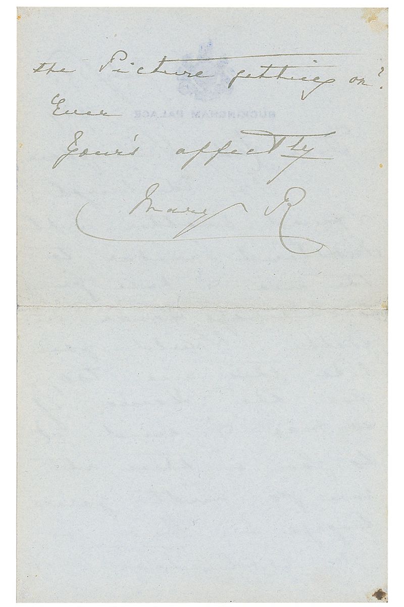 ALS signed “Mary R,” one page both sides, 4.5 x 7.25, Buckingham Palace letterhead, July 19, 1934. Letter to Lady Willingdon. In part: “In Edinburgh I found another Bull Inkstand similar to the one I have given to the Viceroy’s House in Delhi. Would you like this one too, for the House, if so may I send it to you and then it can go with your luggage?” In fine condition, with trivial mounting remnants to corner tips of back page. Lady Willingdon was the wife of the Viceroy of India. Accompanied by two original unsigned vintage “official silver jubilee” 6.25 x 8.25 portraits of Mary and George V.