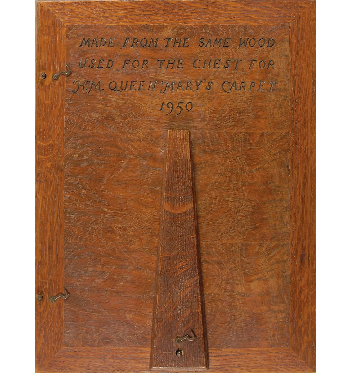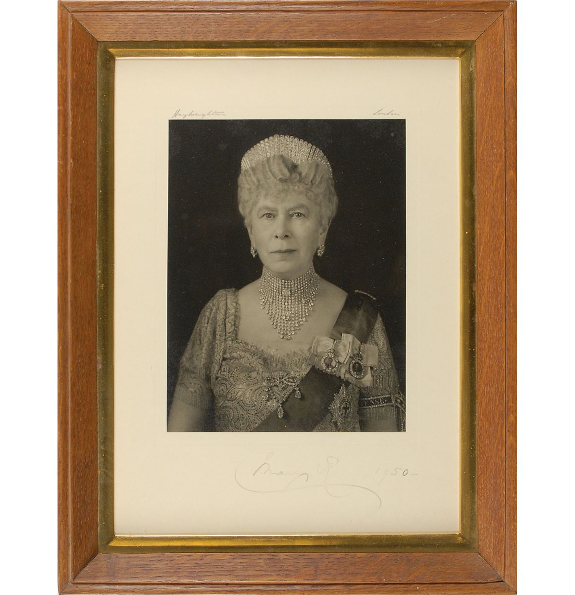 Uncommon matte-finish 6.25 x 8.25 photo of Mary wearing her priceless jewels, affixed to its original 9 x 12.5 mount, signed on the mount in fountain pen, “Mary R, 1950.” Also signed at the top in pencil by the photographer, Henry Wrightson. Wonderfully framed to an overall size of of 12 x 15.5, engraved on the reverse, “Made from the same wood used for the chest for H. M. Queen Mary’s carpet, 1950.” The frame’s backing opens to reveal a letter from Queen Mary’s private secretary, dated April 19, 1950, transmitting the signed photo to the craftsman who made the carpet’s chest. In fine condition. Accompanied by photos of the carpet and chest, and a magazine article describing the carpet’s history. Queen Mary herself produced a handmade carpet measuring over 6 x 10 feet, with the intention of selling it as a contribution to the country’s dollar export drive. A unique piece of royal history.