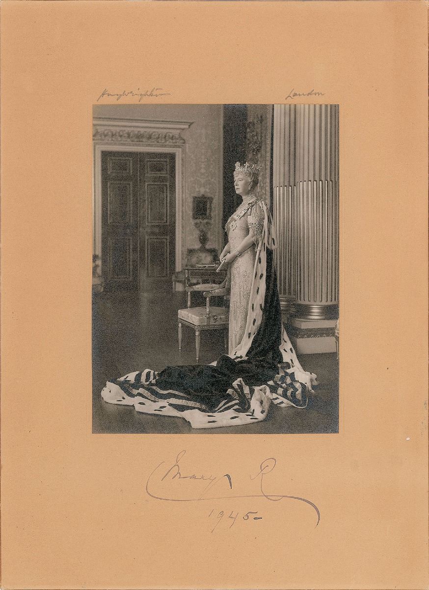 Wife of King-Emperor George V and queen of the United Kingdom and the British Dominions (1867–1953). Vintage matte-finish 4.5 x 6 full-length portrait of Mary Queen of Teck by Hay Wrightson of London, affixed to its original 8 x 11 studio mount, signed on the mount in fountain pen, “Mary R, 1945.” Also signed on the mount in pencil by the photographer, with the reverse bearing a photography studio stamp. In fine condition.