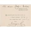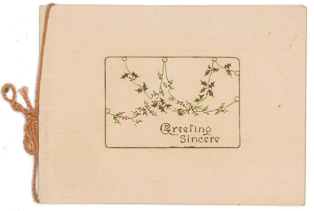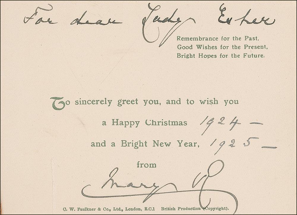 Queen-consort of Great Britain, the wife of George V. In 1891 she accepted a marriage proposal from the Duke of Clarence, who within six weeks died from pneumonia. She then married his brother, the Duke of York, in 1893. Christmas card from 1924-25, 4.5 x 3.25, bearing a pre-printed sentiment inside, and signed under the sentiment, “Mary R,” as well as inscribed at the top by Mary, “For dear Lady Esther.” Small tear to bottom edge of inside pages, and some mild toning to cover, otherwise fine condition.