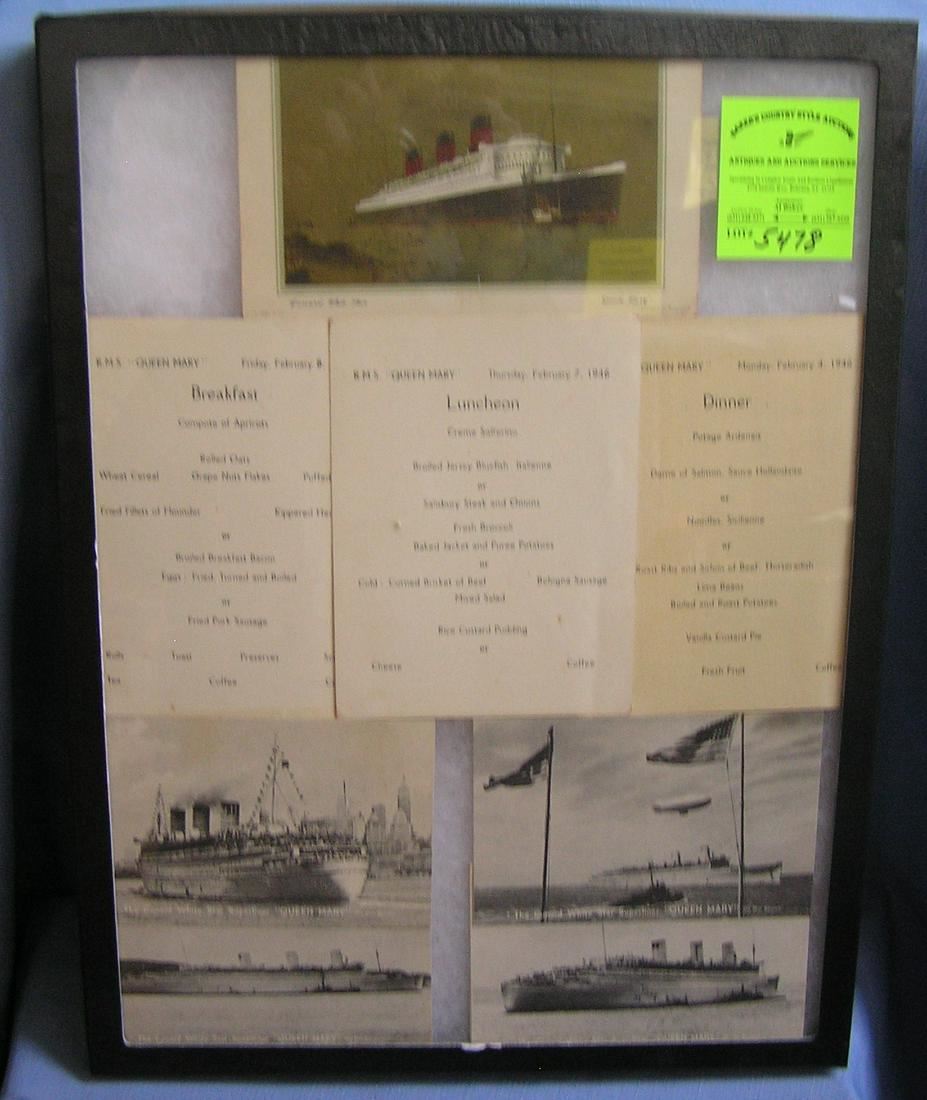 Great early Cunnard white star lines Queen Mary Ocean liner photo post card and menu groupings consists of menu for breakfast , lunch and dinner circa 1946 great early grouping from the woman who traveled aboard during this period est, value $500.00-$600.00