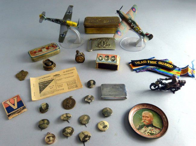 Queen Mary tin and a collection of military related items to include Trench Art etc.