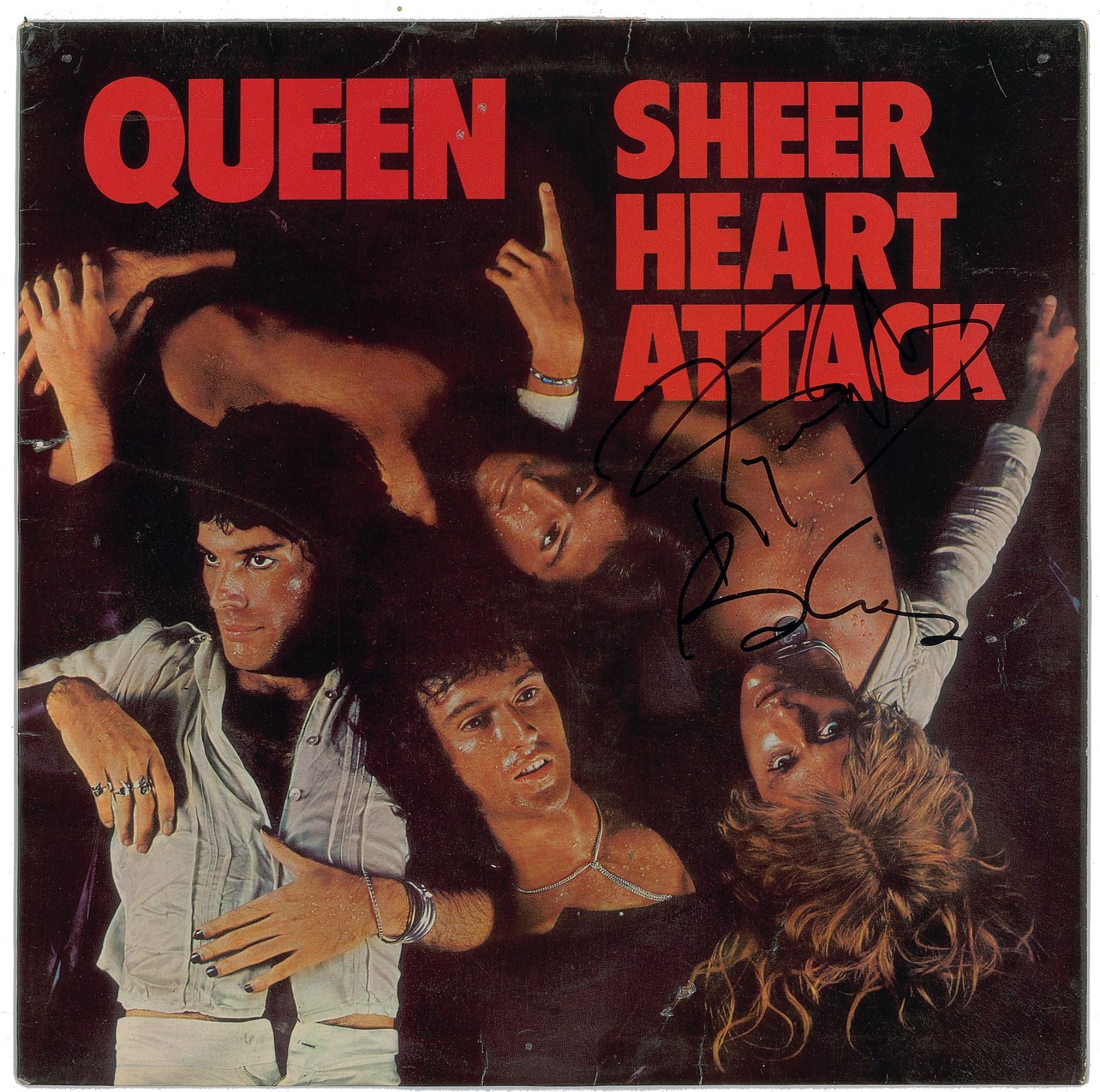Sheer Heart Attack album by Queen, signed on the front cover in black felt tip by Brian May and Roger Taylor. In very good to fine condition, with some edge creasing, staple holes, and tack holes to the upper corners. The record is not included.