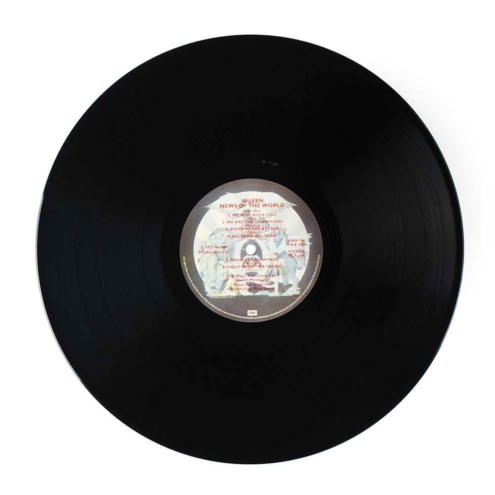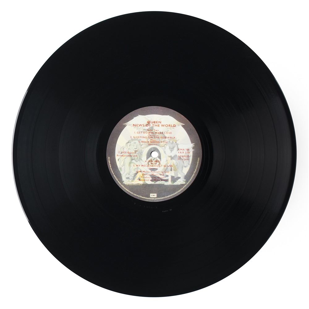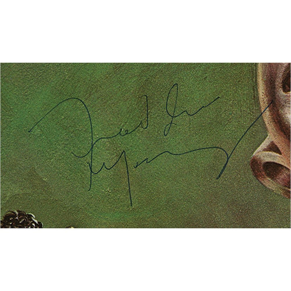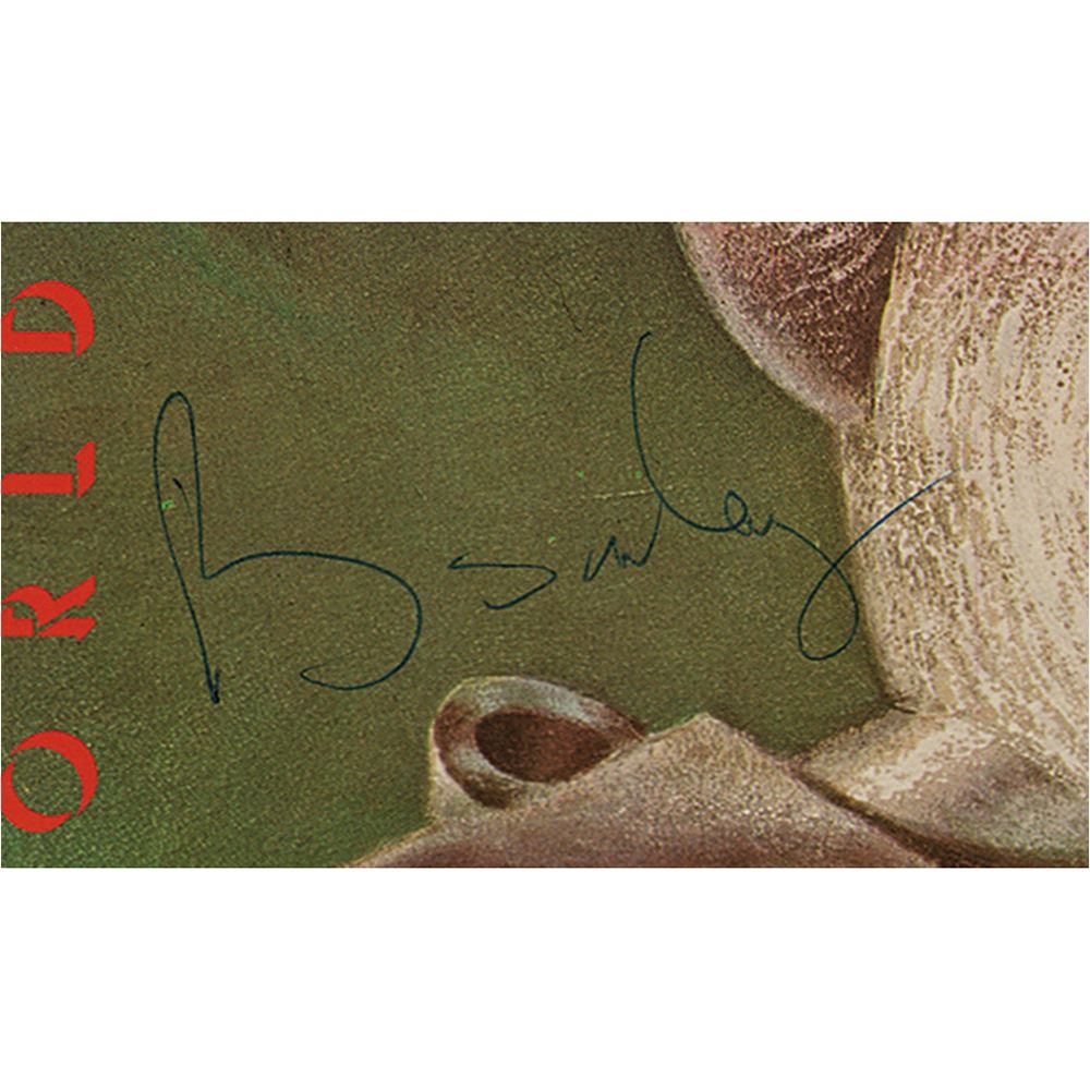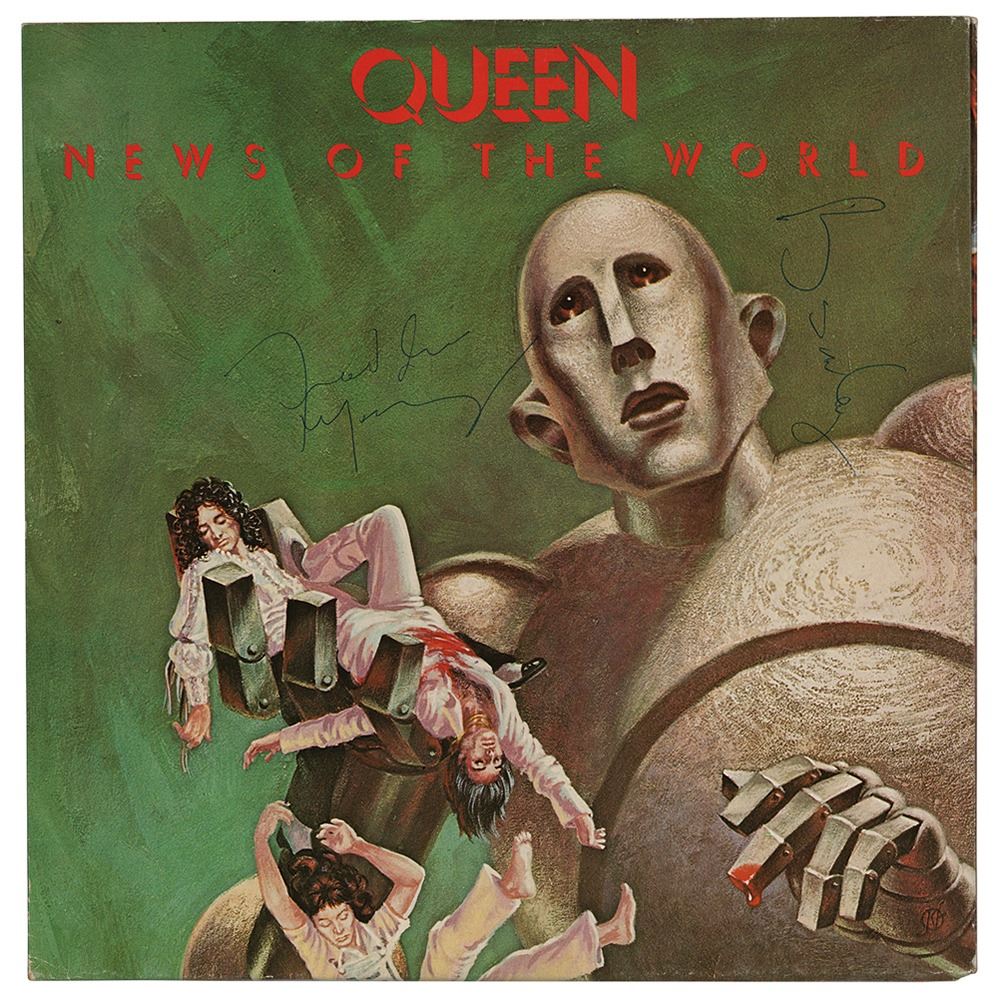 UK vinyl pressing of the 1977 Queen album News of the World, which has been signed on the front cover in blue ballpoint by Freddie Mercury and Brian May. The consignor notes that the autographs were obtained at the Dragonora Hotel in Leeds, England on May 28, 1982, one day before Queen’s show at the Elland Road Football stadium, which was part of the group’s 1982 ‘Hot Space’ tour. In fine condition. The record is included.