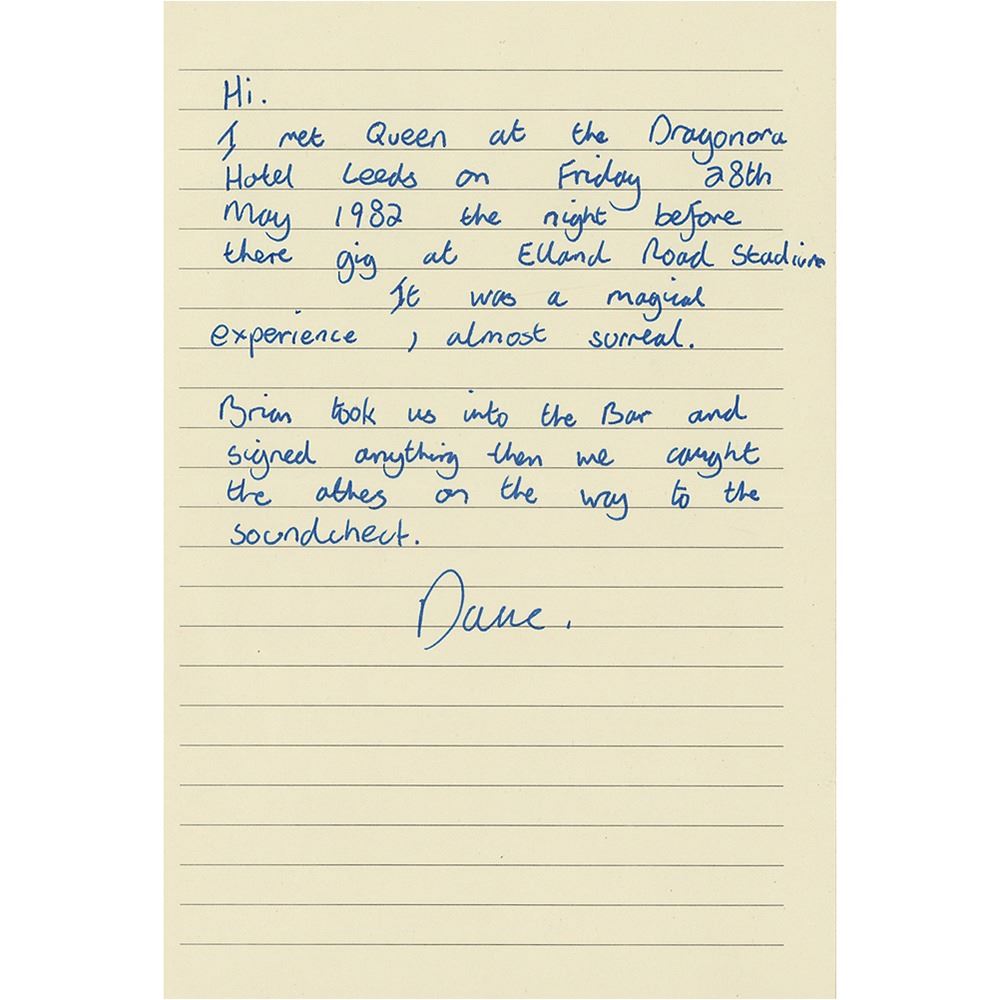 Accompanied by a certificate of authenticity from Tracks and by a letter of provenance from the original recipient, which reads: “I met Queen at the Dragonora Hotel Leeds on Friday 28th May 1982 the night before their gig at Elland Road Stadium. It was a magical experience, almost surreal. Brian took us into the bar and signed anything then we caught the others on the way to the soundcheck.â€