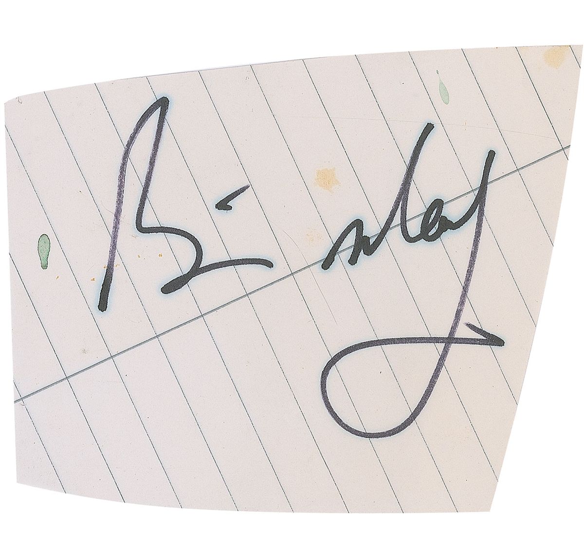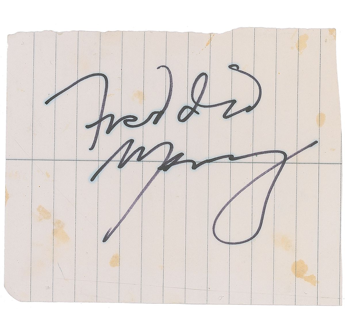 Felt tip signatures, “Freddie Mercury,” and “Brian May,” on individual lightly-lined off-white clipped slips. In fine condition, with some scattered light soiling to both slips, not affecting either signature. Signatures were originally obtained on May 10, 1977, outside of a hotel in Gothenburg, Sweden.