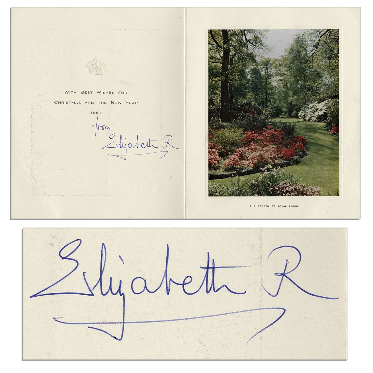 Christmas card signed, ''from / Elizabeth R'' by the Queen Mother. Card opens to a color photograph of the garden at Royal Lodge, opposite a printed sentiment reading, ''With Best Wishes For / Christmas And The New Year / 1961''. A gilt crown appears on the otherwise plain front cover. Accompanied by the original mailing envelope. Measures 6.75'' x 8.25''. Crease to lower right of front cover and a few faint stains, else near fine.