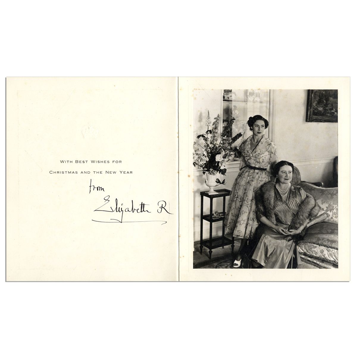 Queen Mother Elizabeth, signed Christmas card and initialed envelope. The card bears a gilt cypher to the cover and opens to the matriarch's signature in black ink ''from / Elizabeth R''. Opposite the signature and printed greeting is affixed a lovely matte photo of the Queen Mother and her daughter, Queen Elizabeth. Included in the lot is the envelope bearing her initials ''ER'' to the lower left, hand-addressed to Mrs. Laud in Chatham. Greeting card measures 6.75'' x 8.25''. Light toning and foxing to interior along fold, else fine.