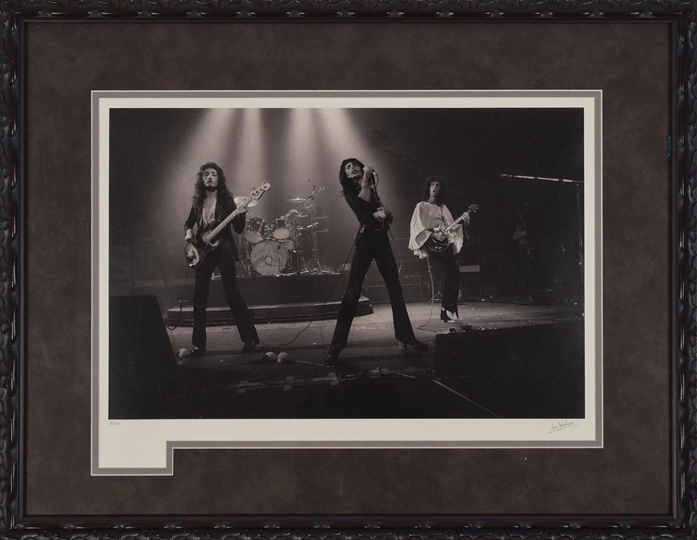 Gorgeous limited edition fine art 18.5 x 13 print of an Ian Dickson photograph of Queen during a dramatic live performance at London's Rainbow Theatre in late November 1974, numbered 2/120, signed in the lower right in pencil by the photographer. Embossed in the lower left with a "The Rock Music Photographs of Ian Dickson" blindstamp. Handsomely double-matted and framed to an overall size of 26.25 x 20.75. In fine condition.