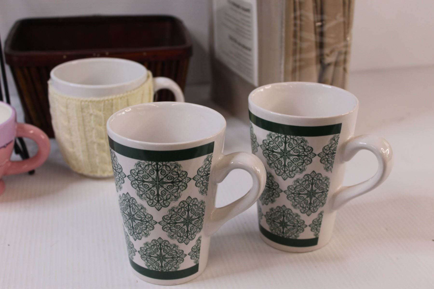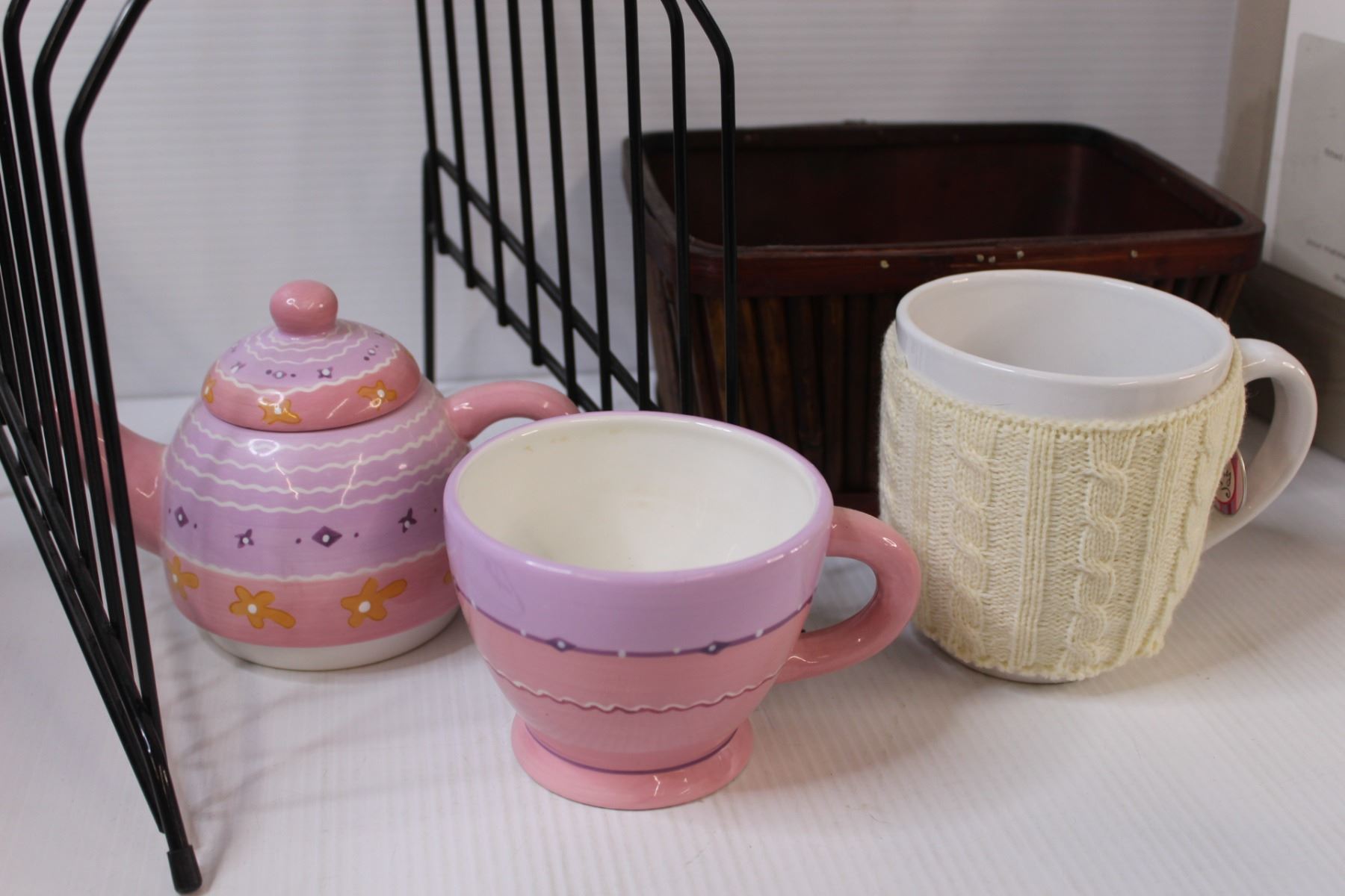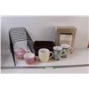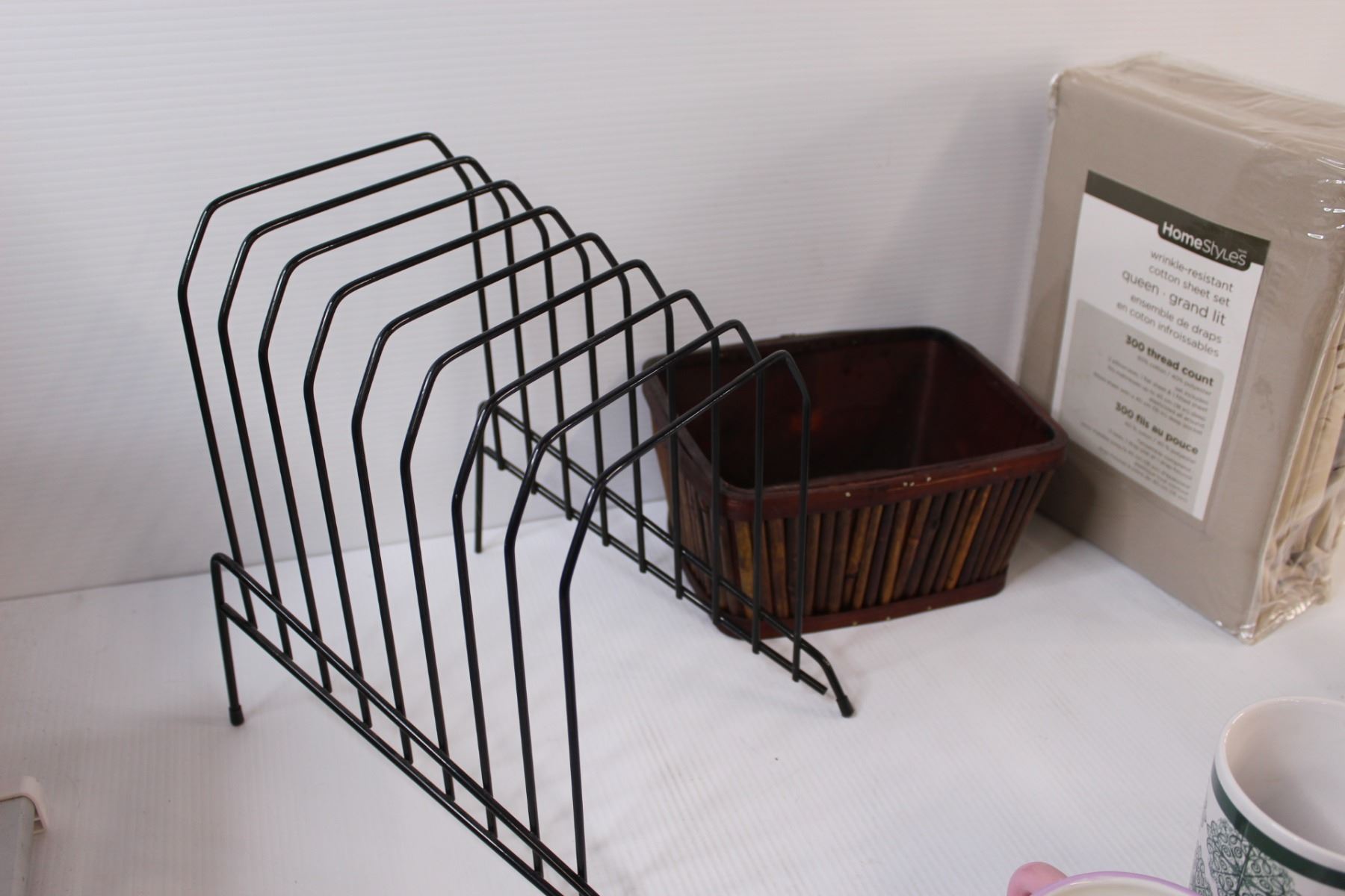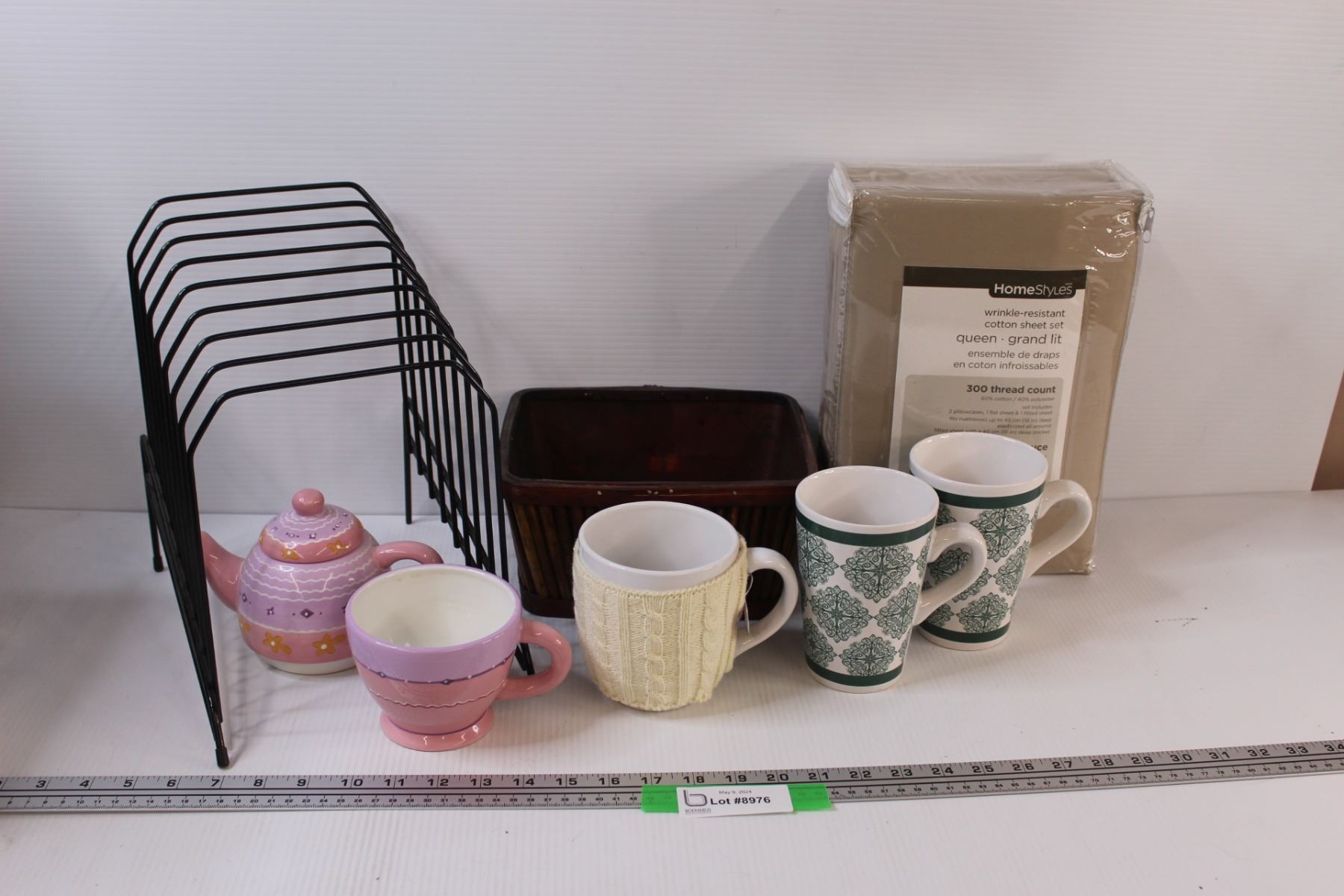 Queen Sheet Set - NIB, (3) Mugs, (1) Teapot & Cup Set, Planter Box, Magazine/Record Rack
