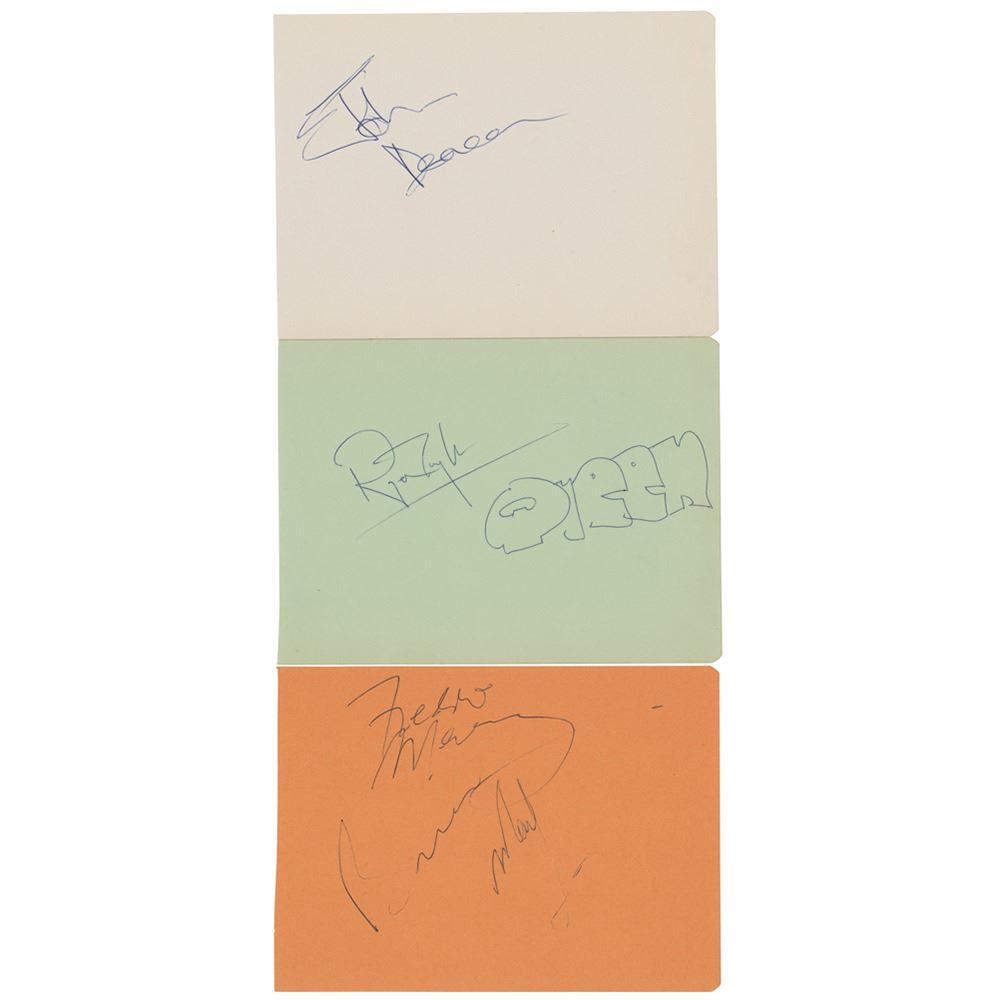 Ballpoint signatures of Queen on three separate 5.5 x 4 album pages—“Freddie Mercury†and “Brian May,†“Roger Taylor,†who adds “Queen†in block letters, and “John Deacon.†The consignor notes that the signatures were obtained at the Roundhouse hotel in Lansdowne, England on November 23, 1975, on the day that Queen were due to perform in nearby Bournemouth at the Winter Gardens. In fine condition, with skipping to May's signature.