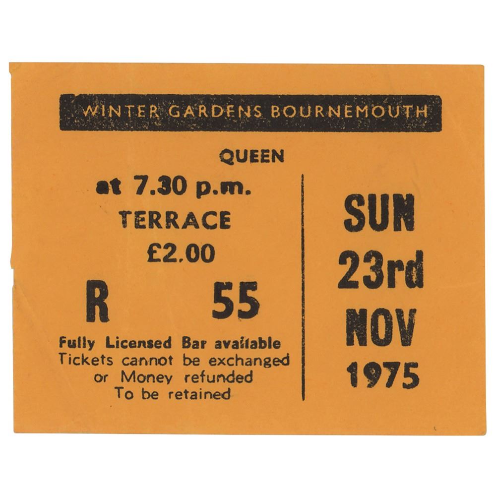 Accompanied by a certificate of authenticity from Tracks, a concert ticket from the Winter Gardens performance, and a letter of provenance from the original recipient, which reads: “On the morning of Sunday 23rd November 1975, myself and a friend went down to the Winter Gardens Bournemouth to watch the road crew load in for the Queen show that night, something we often did, and maybe hang outside to hear the sound check. We asked the crew if they knew where the band were staying, and after being told some wrong places, eventually found them at the Road House hotel in the Lansdowne about half a mile up the road. We saw them through a window eating Sunday lunch, and waited till they finished, eventually coming out one by one, rather than together, which is how we both got our autograph books signed. Freddie was wearing his white satin suit too! Roger chatted a bit, and drew a logo. That was it really, and that night we went to the gig (it was the Night At The Opera tour), the ticket of which I enclose here.â€