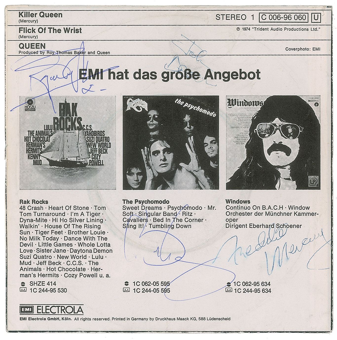 EMI Electrola 45 RPM record sleeve for the Queen single ‘Killer Queen / Flick of the Wrist,’ signed on the back cover in ballpoint by Freddie Mercury, Brian May, John Deacon, and Roger Taylor. In very good condition, with overall creasing, and trivial smudging to Mercury's signature. The record is not included.