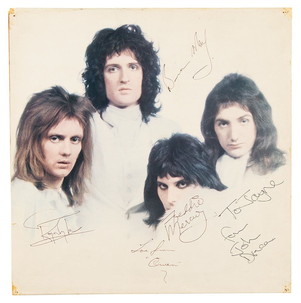 Gatefold removed from the iconic Queen II album, desirably signed and inscribed on the group's large image in ink, "Freddie Mercury," "Brian May," "To Jayne, from John Deacon," and "Roger Taylor." Additionally bears a gift inscription in another hand, "Love from 'Owen.'" In very good to fine condition, with trimmed edges, tack holes, and creasing to corners. The record is not included. Accompanied by a certificate of authenticity from Tracks, noting that the autographs were obtained backstage at Woods Leisure Centre, Colchester, England on 24th March 1974.