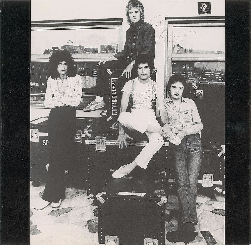 Jazz inner album sleeve, signed in black ballpoint by Freddie Mercury, Brian May, John Deacon, and Roger Taylor. In fine condition, with some skipping to ink in the signatures, which are light but legible. Featuring such hits as 'Fat Bottomed Girls' and 'Don't Stop Me Now,' Jazz peaked at #2 in the UK and #6 on the US charts. A desirable fully signed piece from Queen in their prime.