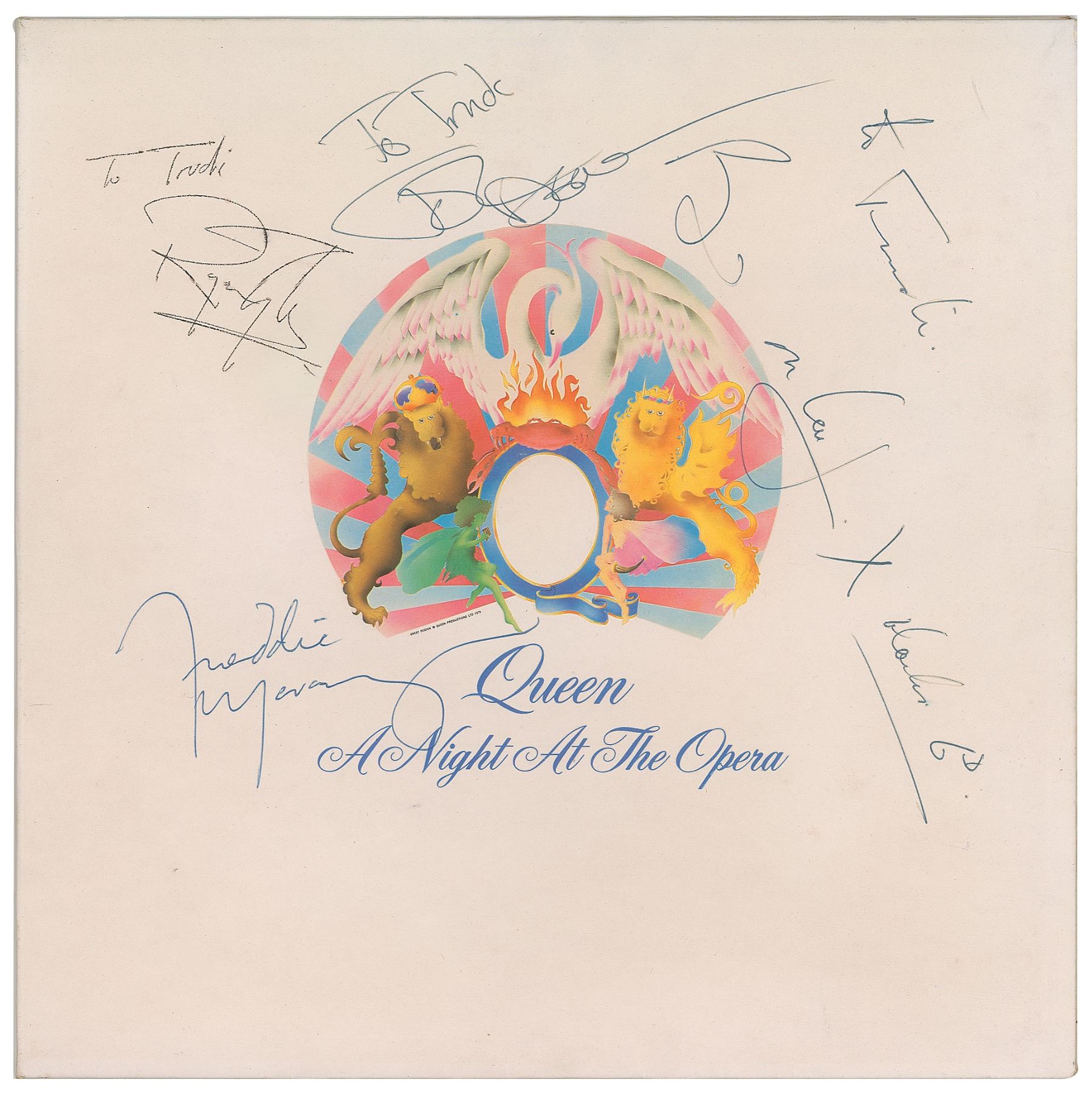 Dutch pressing of Queen's classic album A Night at the Opera, signed and inscribed on the front cover in black ink, "To Trudi, Roger Taylor," and in black ballpoint, "To Trudi, John Deacon," "To Trudi, Brian May, x thanks 6D," and "Freddie Mercury." In fine condition, with professional cleaning to the front cover to remove some aging, in no way affecting the choice signatures. The white vinyl record is included. Accompanied by a certificate of authenticity from Tracks. Consignor notes that the original recipient had given May several sixpence (6d), which he has famously used throughout his career as guitar picks, and that the album was signed at Elland Road stadium in Leeds on May 29, 1982, during Queen's globe-trotting Hot Space Tour. The album was signed for Trudi Humphry, a lifelong fan of Queen, who met the band on numerous occasions, starred in multiple music videos, and was heavily involved with the Official Queen Fan Club in London; the latter role allowed her direct access to the band while attending various concerts with exclusive backstage passes. Signed copies of Queen's magnum opus are highly coveted, with this example all the more desirable as it derives from the collection of a trusted member of Queen's legendary fanbase.