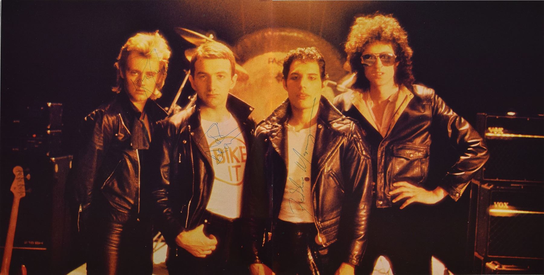Rare program for Queen's 1979 Crazy Tour, twenty-six pages, 9.5 x 9.5, signed on the centerfold band image in blue ballpoint by Freddie Mercury, John Deacon, and Roger Taylor. In fine condition, with general light handling wear. Provenance: Sotheby's, September 24, 2003.