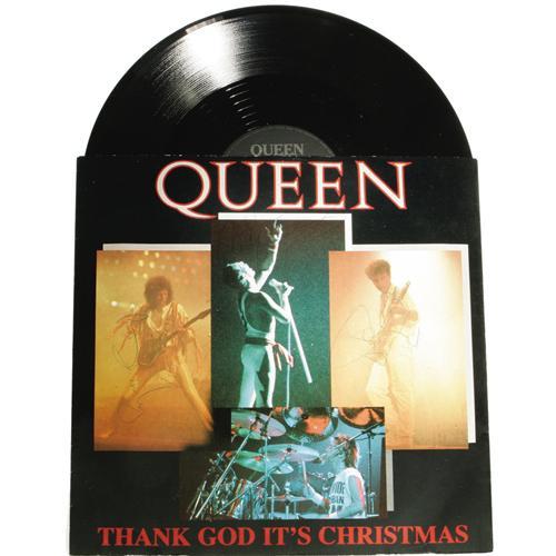 <B>Queen Autographed "Thank God It's Christmas" 12" Single.</B></I> A vinyl copy of the 1984 holiday 12" single, signed on the cover by Freddy Mercury, Brian May, Roger Taylor, and John Deacon in blue ballpoint. The cover is in Very Fine condition with minor wear, and the record itself is in Excellent condition.<I>Accompanied by LOA from PSA/DNA.</B></I><BR><BR><b>Shipping:</b> Recordings (<a target="_blank" href="http://www.heritageauctions.com/common/shipping.php">view shipping information</a>)