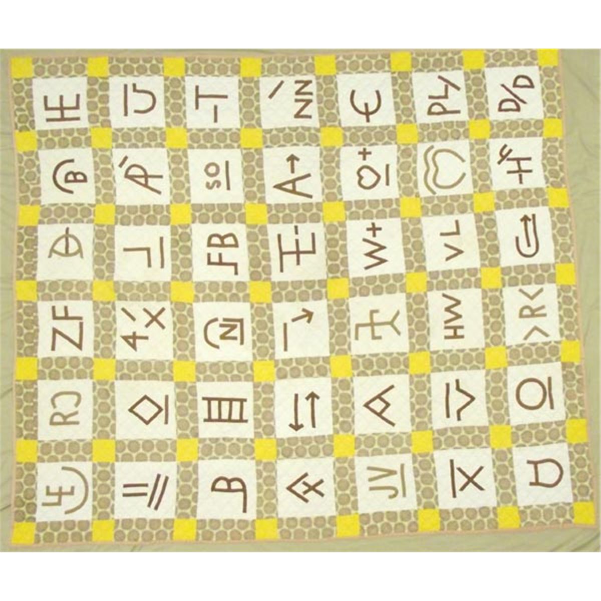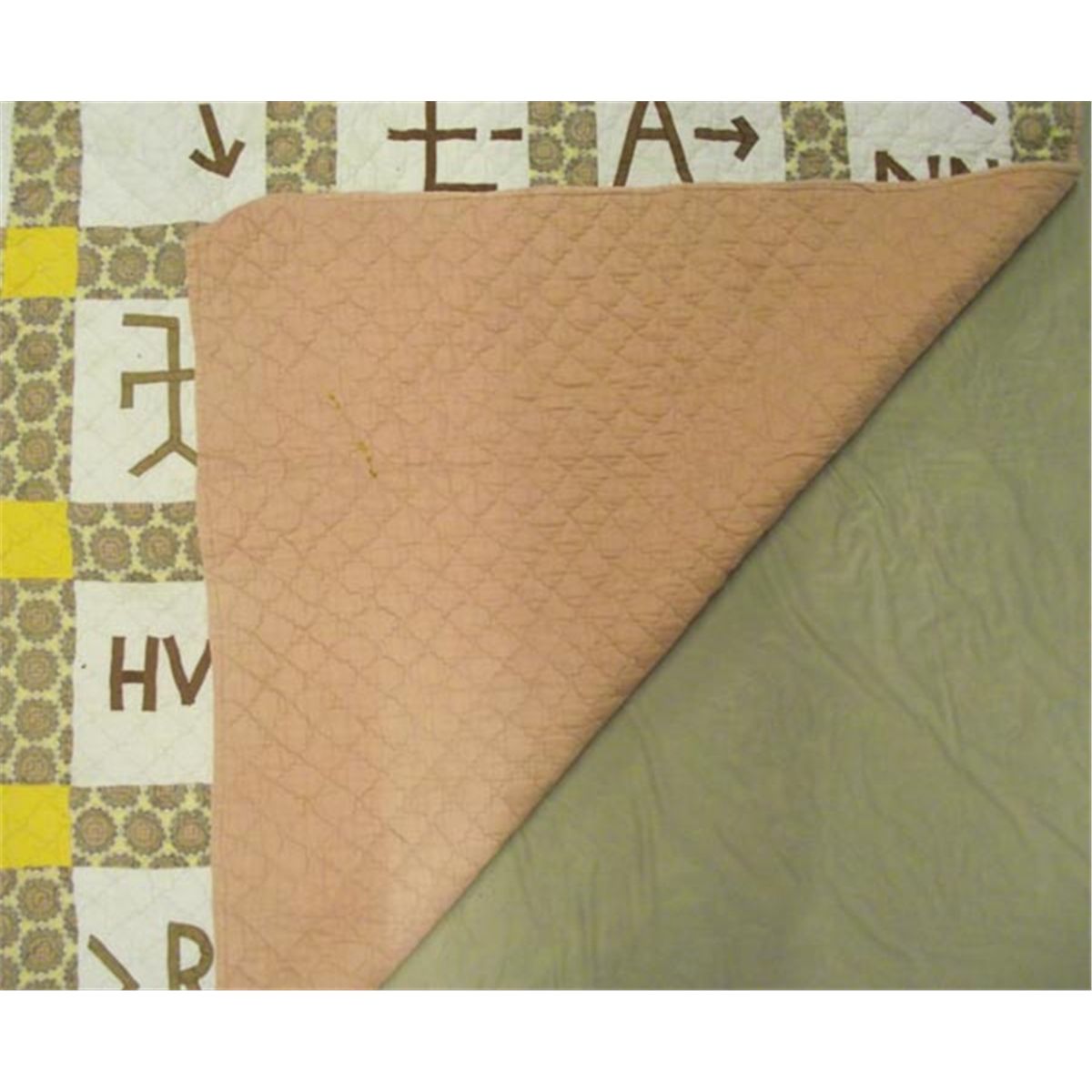 Queen Size Bed Quilt. Machine quilted, 1970 by Dort Bynum. Size is 64'' x 78'' with machine appliqued ranch brands. Some staining. Buyers Pay Actual Shipping and Handling Charges(see terms and conditions for more information).
