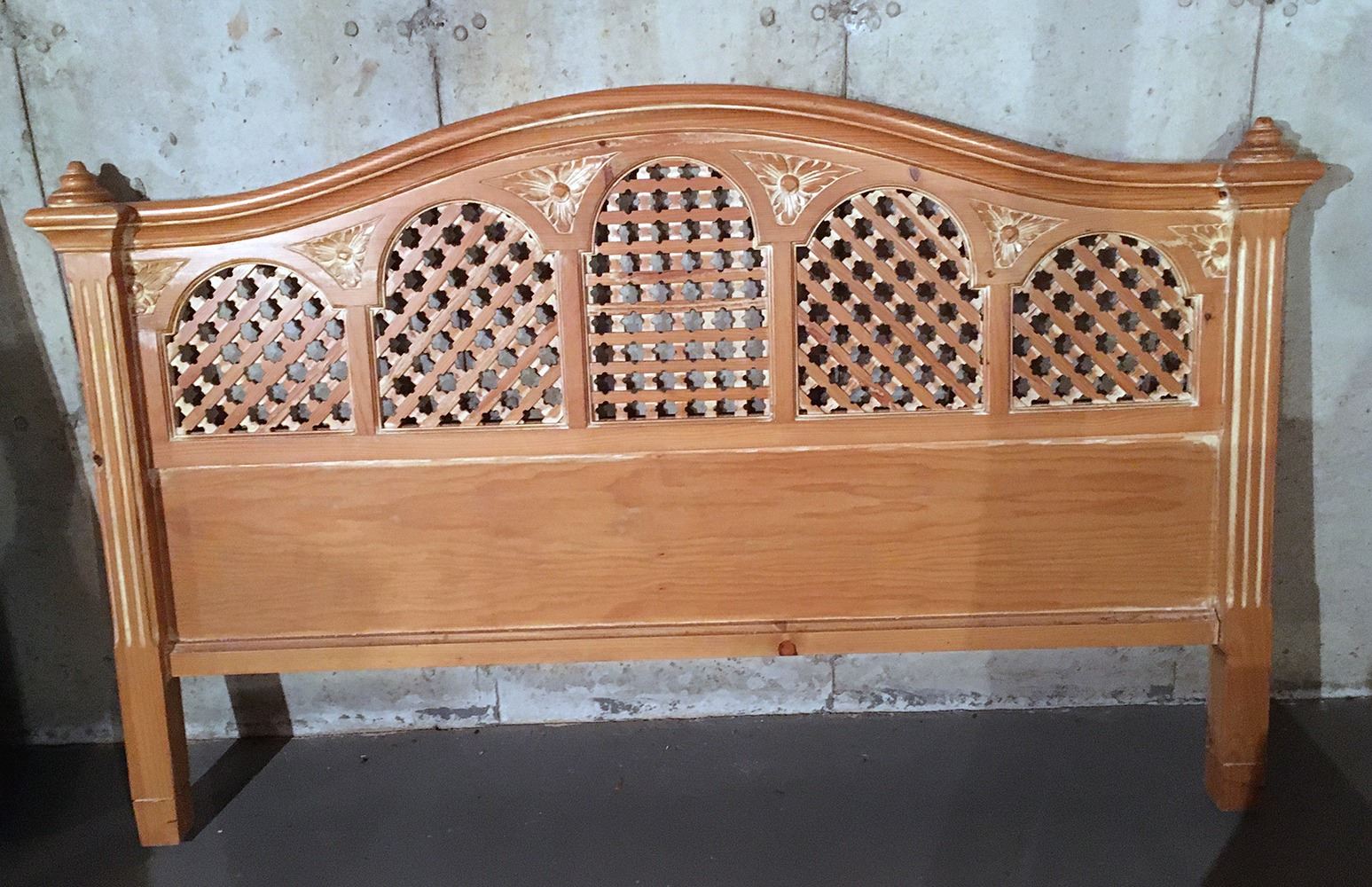 Queen sized headboard, with lattice bak, pine with white wash, measures approx. 72 inches wide x 46 inches tall.
