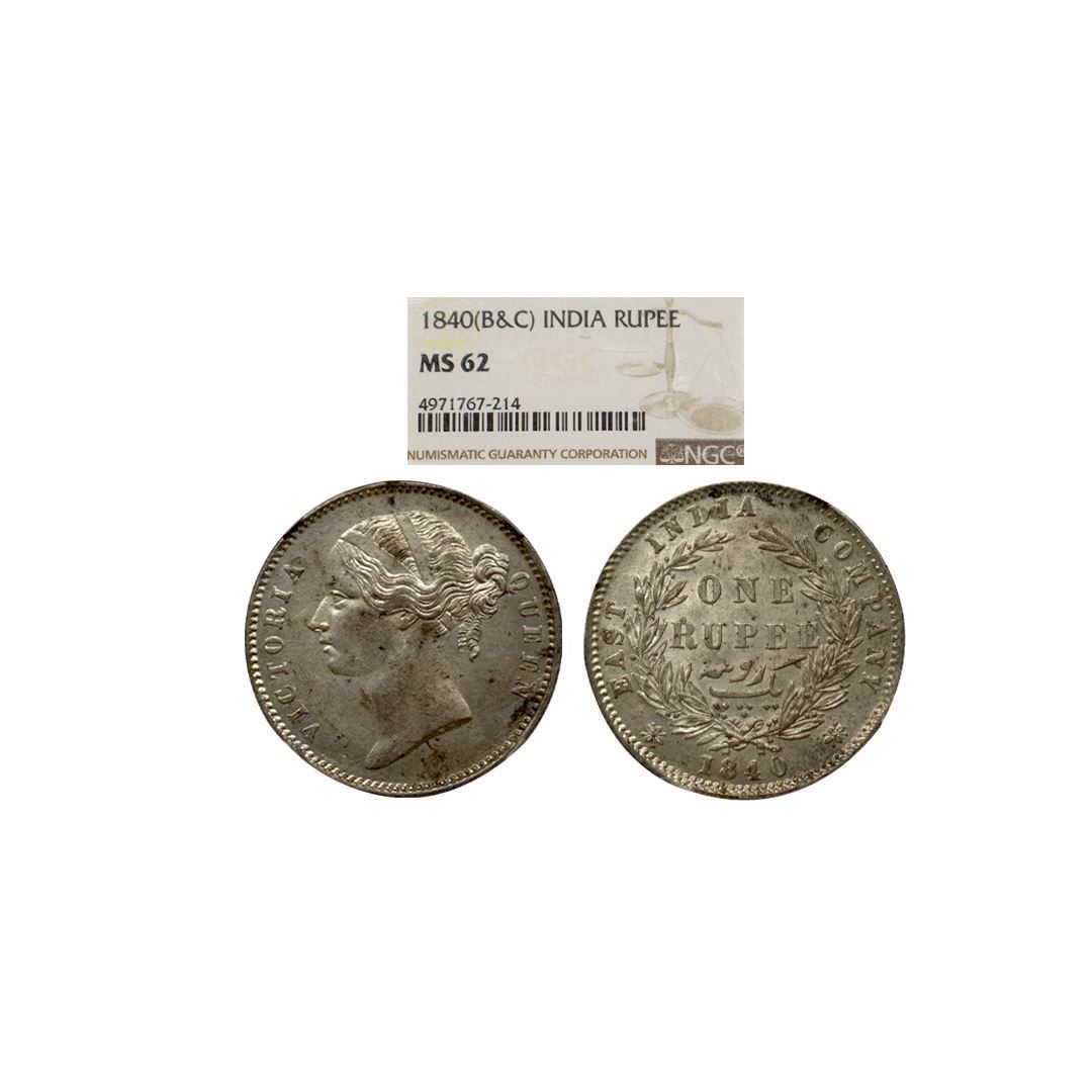 Victoria, 1840, Silver Rupee, Bombay Mint, Graded by NGC as MS 62, rare.
