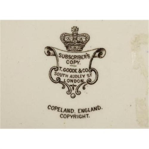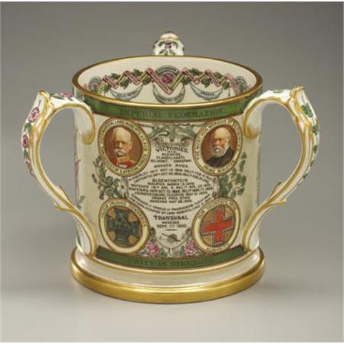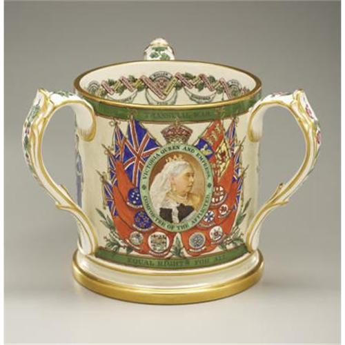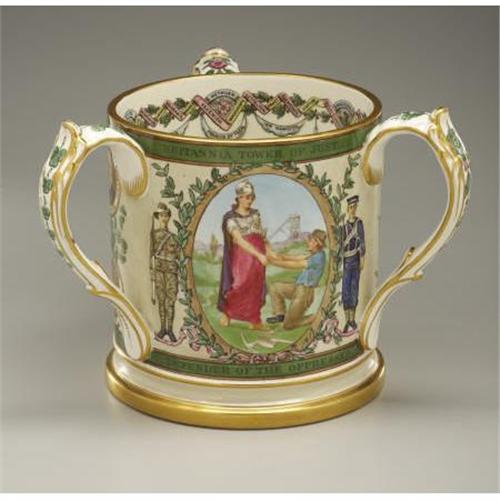 <B>Copeland Spode Queen Victoria Porcelain Commemorative Boer War Three-handled Loving Cup</B></I><BR><I>1899</B></I><BR><BR>Cylindrical, one side with the profile bust of Queen Victoria, inscribed <I>Victoria Queen and Empress, Comforter of the Afflicted</B></I>, surrounded by the Union Jack and flags and seals of the above the motto <I>Equal Rights for All</B></I>, another side decorated with the portraits of the Commander in Chief, Field Marshall Lord Roberts, and the Prime Minister, The Marquis of Salisbury, the third side with a full length figure of Britannia being welcomed by a kneeling South African farmer and the inscription <I>Britannia Tower of Justice, Defender of the Oppressed</B></I>, the interior of cup around the border decorated with further names on ribbons, on a gilded base-5 ½ in. high<BR><BR><b>Shipping:</b> Requires 3rd Party Shipping (<a target="_blank" href="http://www.heritageauctions.com/common/shipping.php">view shipping information</a>)