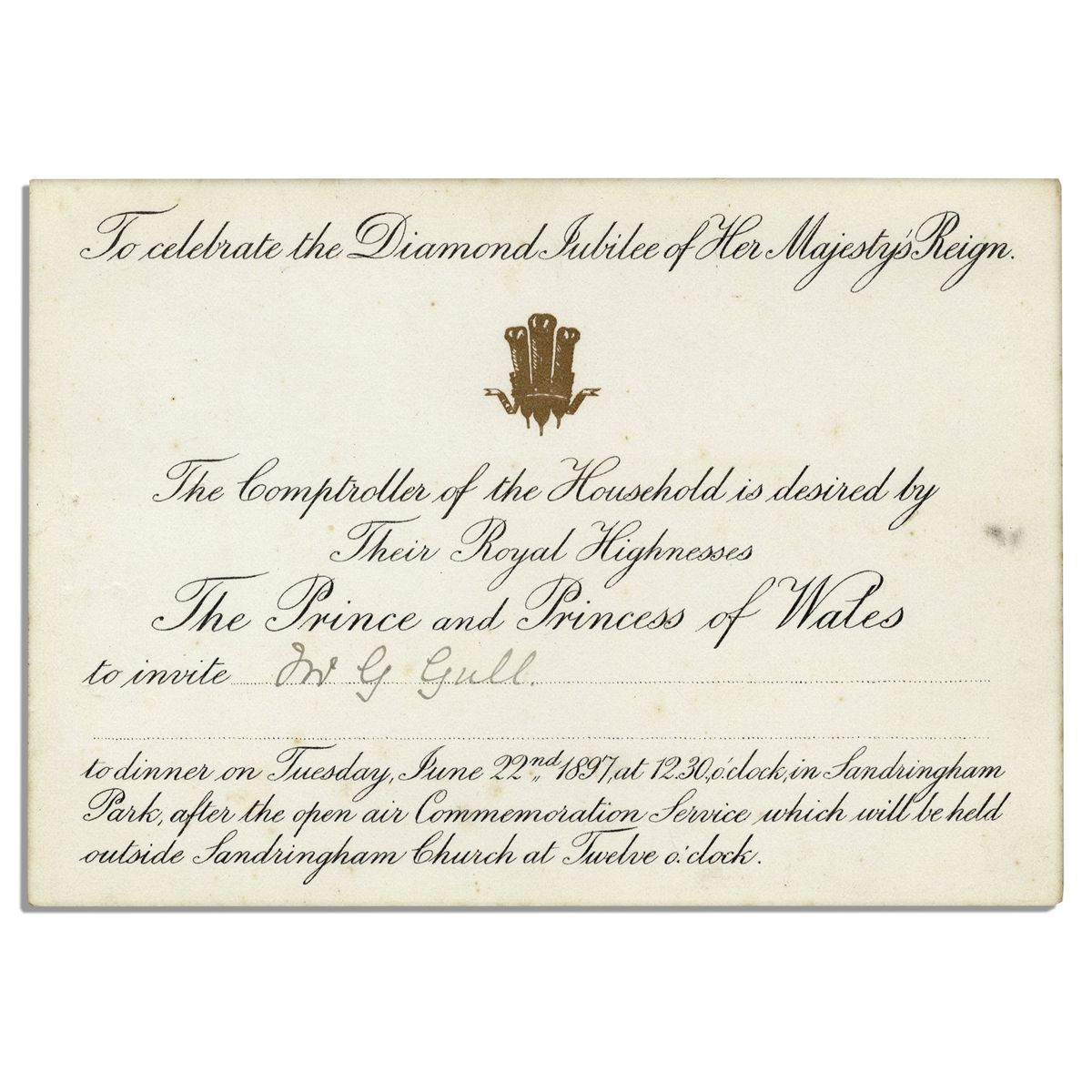 Invitation to Queen Victoria's diamond jubilee dinner at Sandringham Park, celebrating the sixtieth anniversary of her ascension to the throne. Queen Victoria is the longest-reigning Royal in British history and longest-reigning queen in recorded world history. Partially printed invitation bears a gilt feather design at the top and reads in full, ''To celebrate the Diamond Jubilee of Her Majesty's Reign. The Comptroller of the Household is desired by Their Royal Highnesses The Prince and Princess of Wales to invite W G Gull to dinner on Tuesday, June 22nd 1897 at 12:30 o'clock in Sandringham Park, after the open air Commemoration Service which will be held outside Sandringham Church at Twleve o'clock.'' Measures 7.25'' x 5''. Light toning and a smudge near right edge, else near fine.