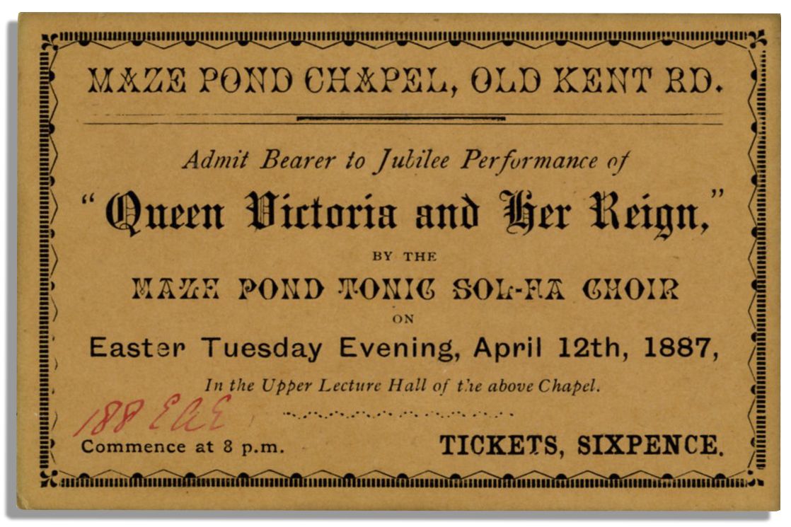 Ticket to Queen Victoria's diamond jubilee concert at Maze Pond Chapel the evening of 12 April 1887, celebrating the sixtieth anniversary of her ascension to the throne. Queen Victoria is the longest-reigning Royal in British history and longest-reigning queen in recorded world history. Invitation reads in part: ''Maze Pond Chapel, Old Kent Rd. / Admit Bearer to Jubilee Performance of 'The Queen Victoria and Her Reign,' By the Maze Pond Choir...'' Measures 3.75'' x 2.25''. Red ink notation to lower left. Near fine.