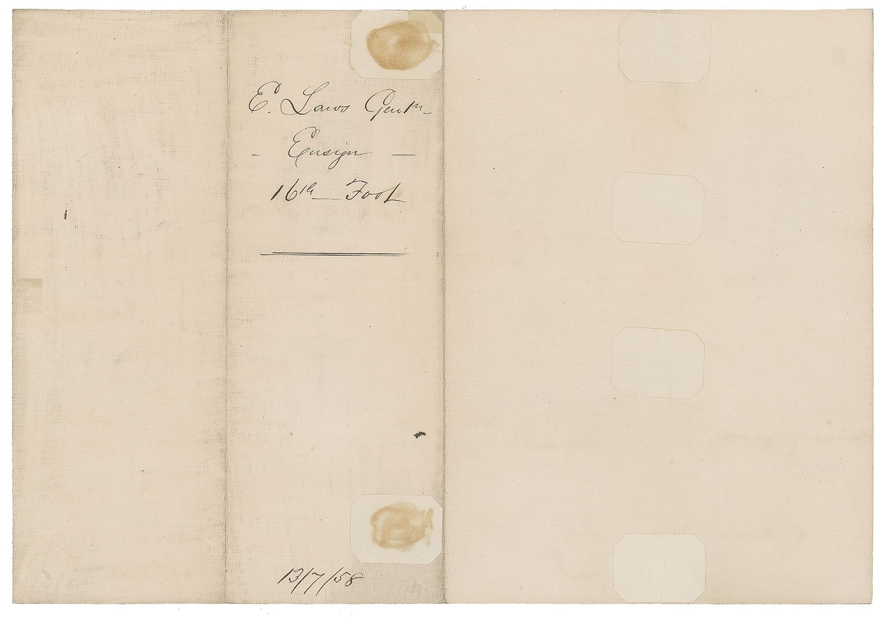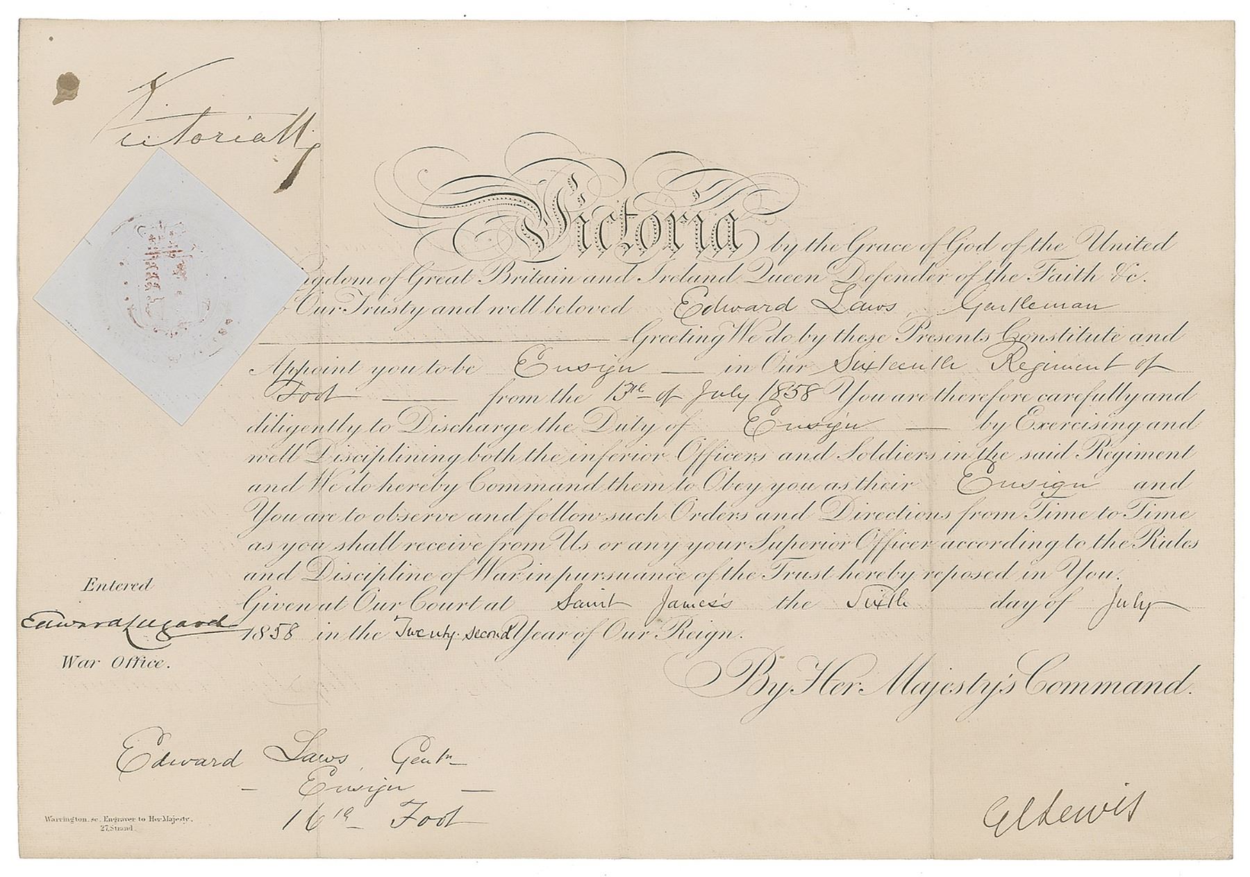 Partly-printed DS, signed “Victoria R.,” one page, 13.75 x 9.5, July 6, 1858. Queen Victoria appoints Edward Laws to be an "Ensign in Our Sixteenth Regiment of Foot." Signed neatly in the upper left by the queen, and countersigned below by George Cornewall Lewis. Light blue paper seal affixed directly below the queen's signature. In fine condition.