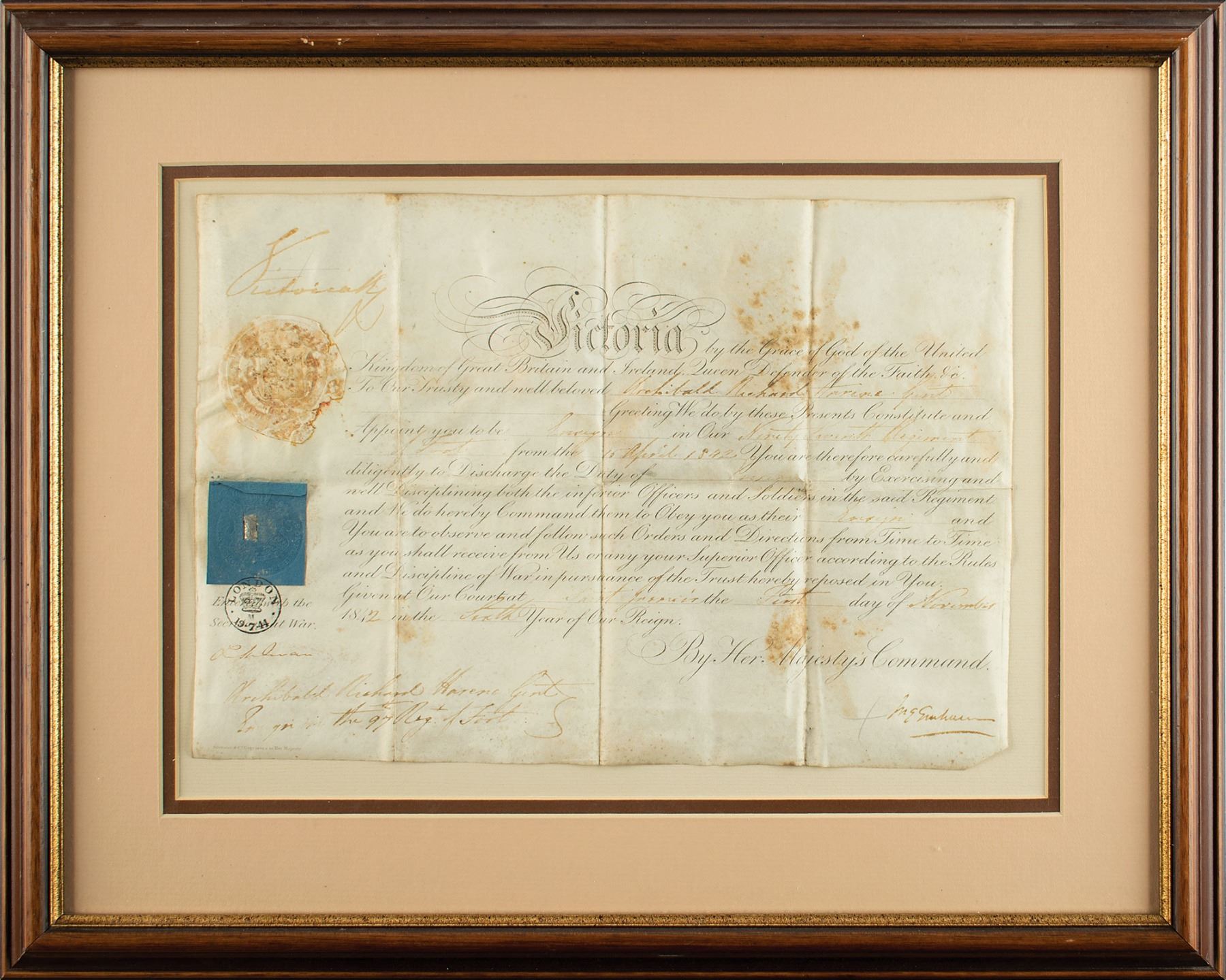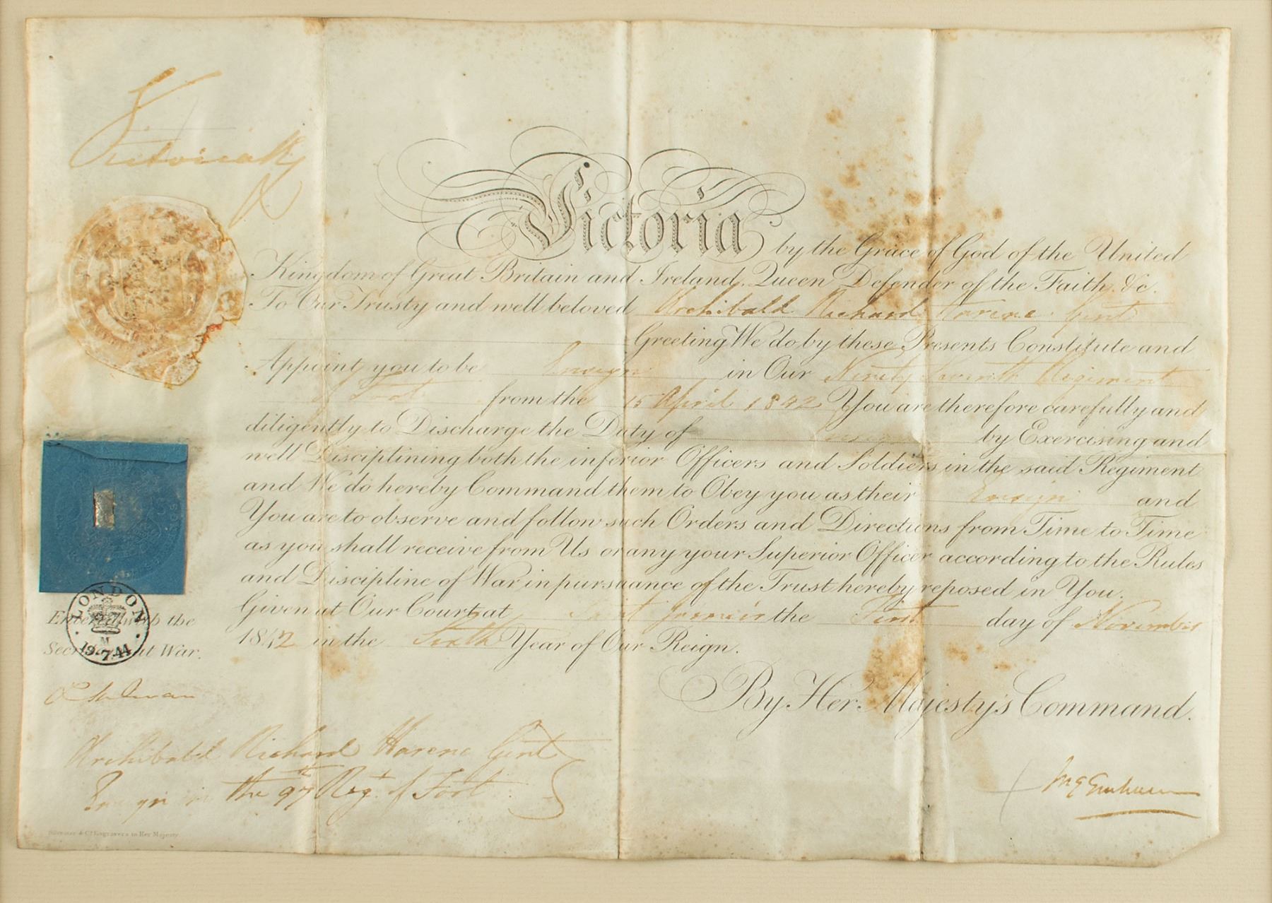 Partly-printed vellum DS, signed “Victoria R,” one page, 13 x 9, November 1, 1842. Queen Victoria appoints Archibald Richard Harene "to be Ensign in Our Ninety Seventh Regiment of Foot." Signed at the head by Queen Victoria. The affixed paper seal and blue ribbon are soiled but intact. Mounted, double-matted, and framed to an overall size of 20 x 16. In very good to fine condition, with scattered staining.