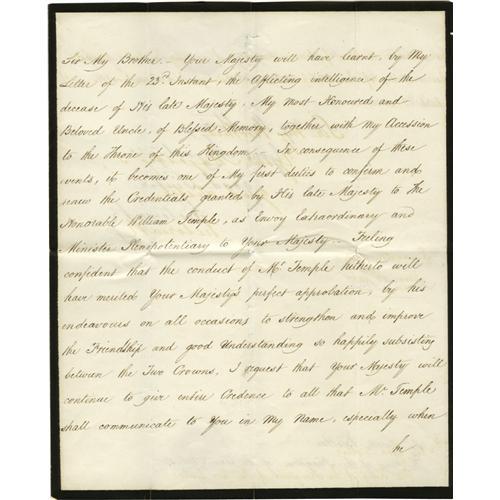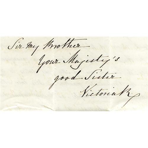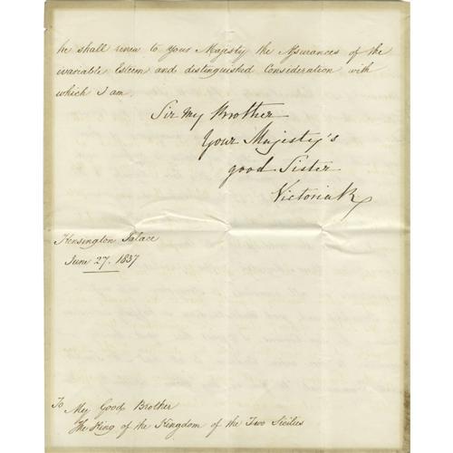 <B> Queen Victoria Writes to the King of the Two Sicilies Less Than A Week after Becoming Queen</B></I> HRH Queen Alexandrina Victoria (1819-1901). Rare letter of the State, with a closing in her hand, 2 pages on a four page folder, Kensington Palace, June 27, 1837; addressed on the outside leaf to "<I> My Good Brother, The King of the Kingdom of the Two Sicilies</B></I>," <BR><BR> The young Queen Victoria, having risen to the throne on the death of her uncle William IV less than a week before, just twenty-seven days after her eighteenth birthday, writes to the King of the Two Sicilies asking his permission to keep the British Minister in his post there. Reads in part: "<I> Sir, My Brother, Your Majesty will have learnt by my letter on the 23rd Instant, the afflicting intelligence of the deceased of His late Majesty, My most Honored and Beloved Uncle of Blessed memory, together with my Accession to the Throne of this Kingdom. In memory, together with my Accession to the Throne of this Kingdom. In consequence of these events, it becomes one of my first duties to confirm and renew the credentials granted by His late majesty to the Honourable William Temple, as Envoy Extraordinary and Minister Plenipotentiary to your Majesty. Feeling confident that the conduct of Mr. Temple hitherto will have merited Your majesty's perfect approbation, by his endeavors on all occasions to strengthen and improve Crowns, I request that Your Majesty will continue to give entire Credence to all that Mr. Temple shall communicate to you in My Name...</B></I>" <BR><BR> Queen Victoria did not take her role as Queen of England lightly. Upon becoming Queen, she immediately banished form Court Sir John Conroy, and ambitious Irish officer and her widowed mother's boyfriend, who had tried to exert power over her as a child. Extremely rare correspondence between two monarchs.