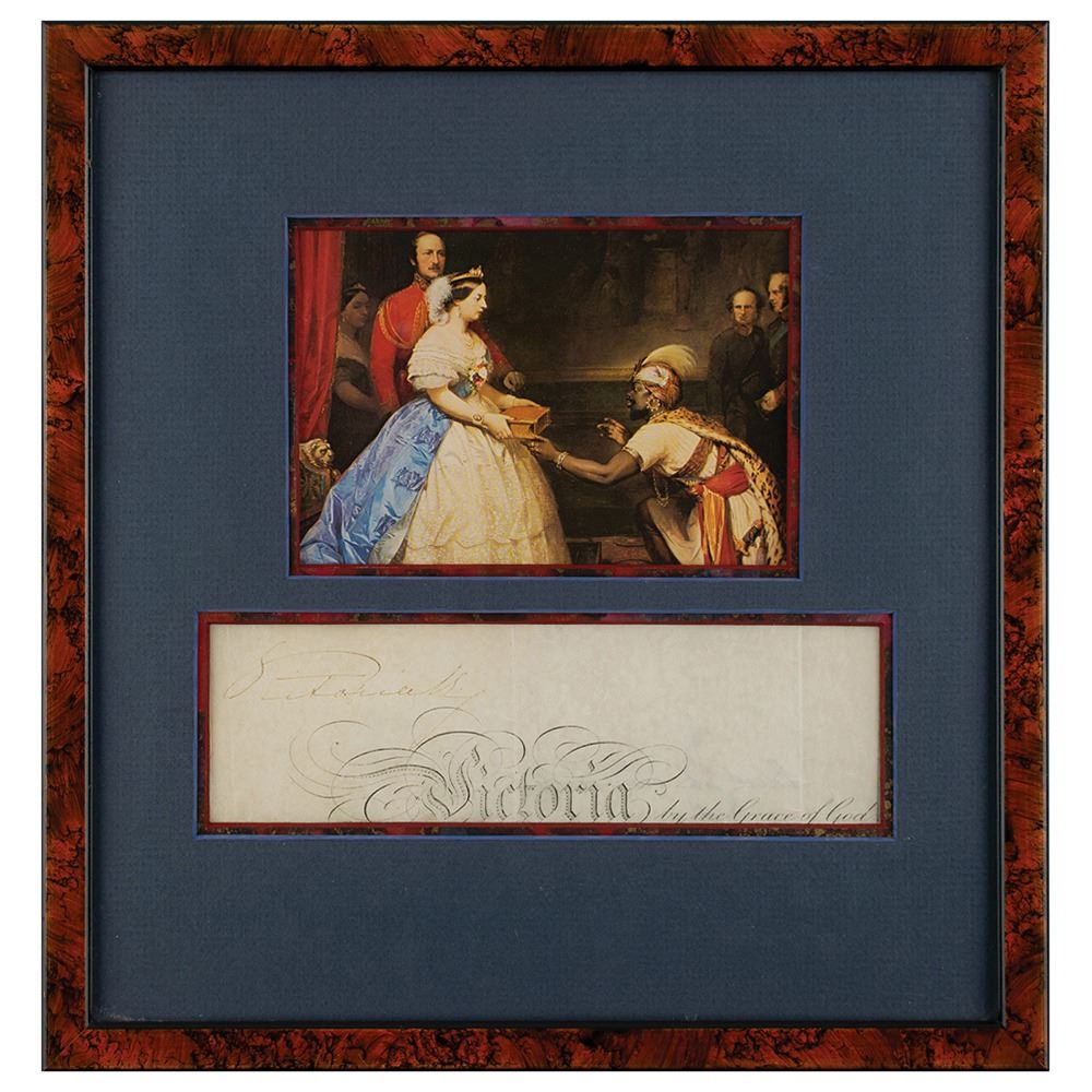 Ink signature, "Victoria R,” on an off-white 8 x 2.25 slip cut from the head of a larger document. Attractively double-matted and framed with a portrait to an overall size of 11.75 x 12.5. In fine condition, with the signature somewhat light, but fully legible.