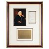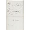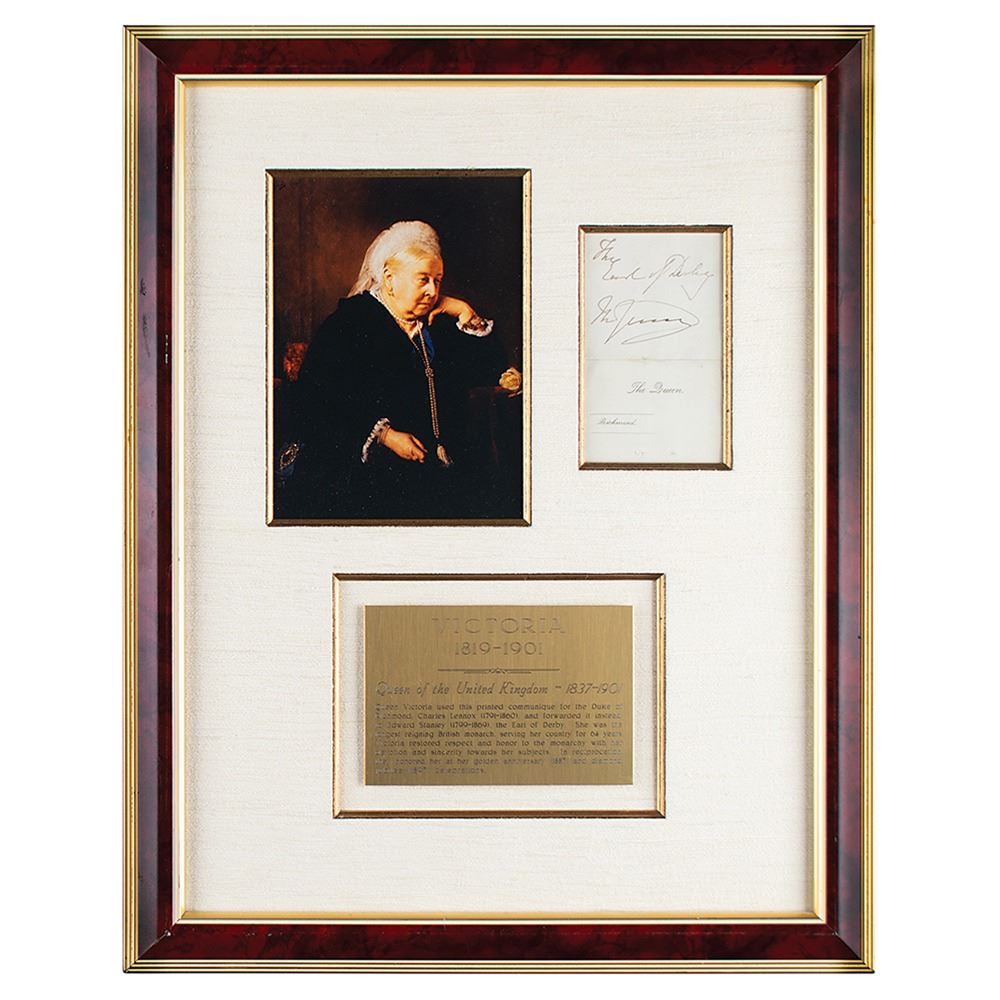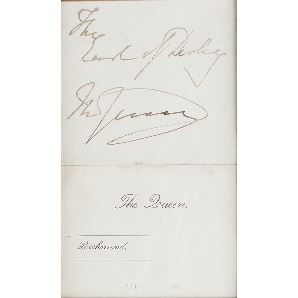 Ink signature, "The Earl of Derby, The Queen,†on an off-white 3 x 5.25 sheet of her personal stationery. Cloth-matted and framed with a portrait and engraved plate to an overall size of 16.75 x 21; window to frame backing shows reverse of sheet. In fine condition, with a central horizontal fold, and two small holes at the bottom edge.
