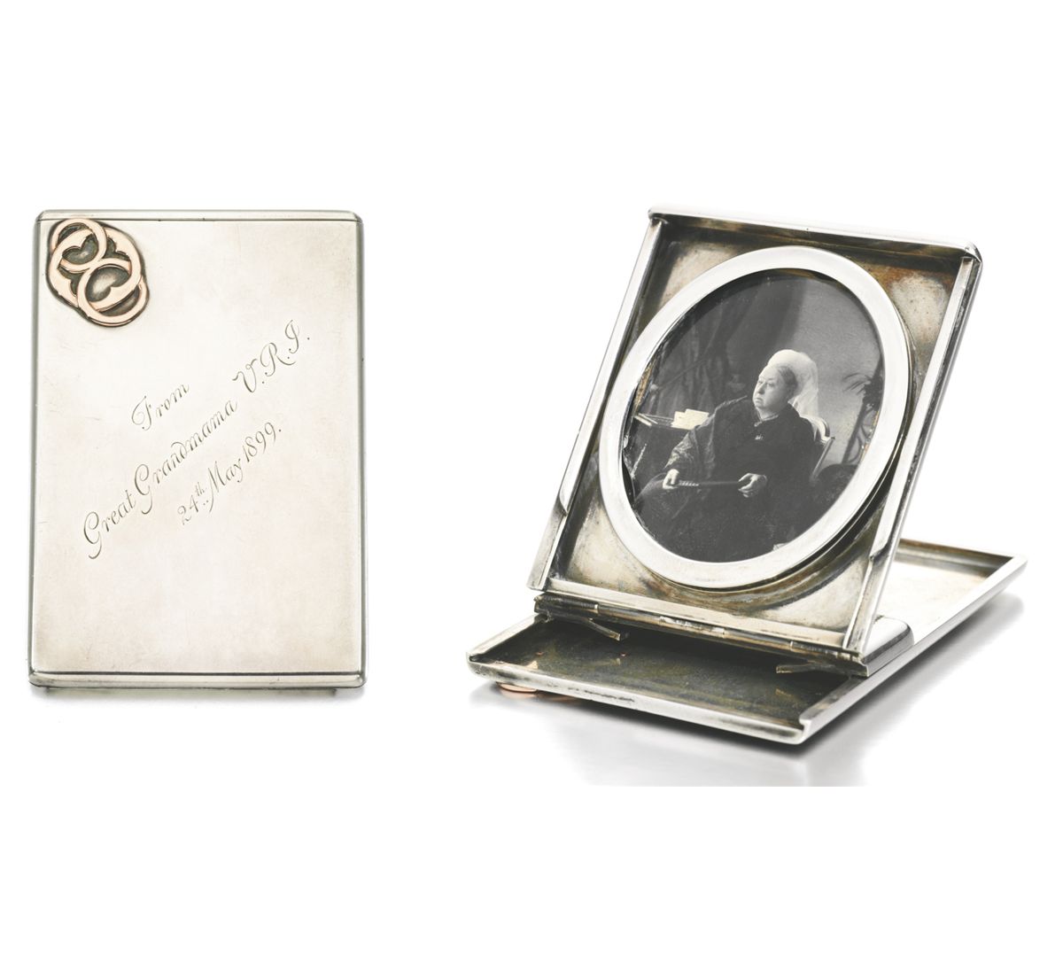 Silver photo frame gifted by Queen Victoria to one of her great-grandchildren. Pocket frame is engraved diagonally across the cover, ''From Great Grandmama V.R.I. 24th May 1899''. Case opens with a sliding cover decorated with an applied gold design to the upper left. Inside is an oval-shaped photo of the Queen. Case bears the maker's mark of W. R. Wright for Wright & Davis, and a British hallmark. Measures approximately 3'' x 2'' x 0.25''. Near fine. With provenance from Sotheby's 1987 Geneva, Switzerland sale of the Jewels of the Duchess of Windsor.