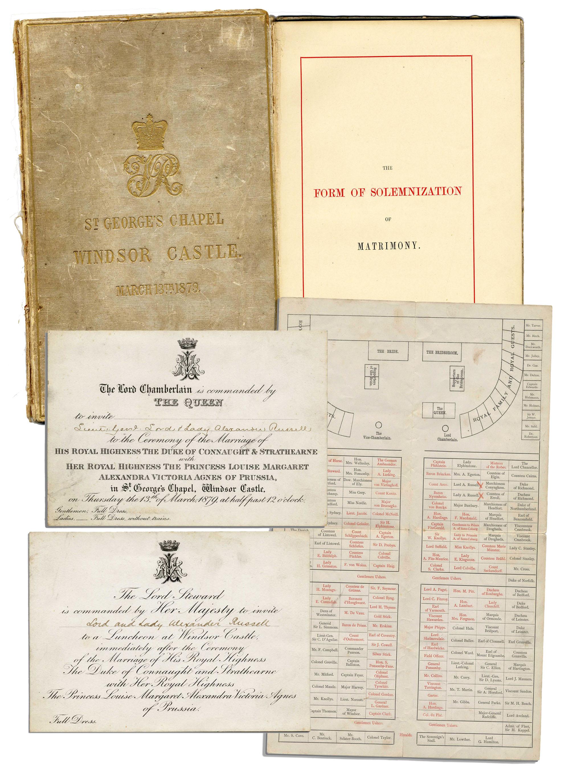 Official wedding program for Prince Arthur, the son of Queen Victoria, who married Princess Louise Margaret of Prussia at Windsor Castle on 13 March 1879. Program features cream-colored silk moire boards and endpapers as well as the royal crown and lettering in gilt on cover. Program runs approximately 16 pages, entitled ''The Form of Solemnization of Matrimony'' printed by Harrison and Sons. Front cover detached and moderate soiling, overall in fair to good condition. All interior pages present, in near fine condition.