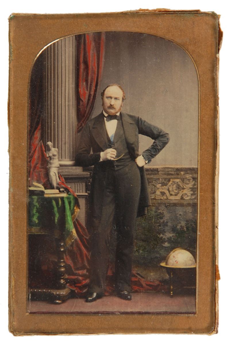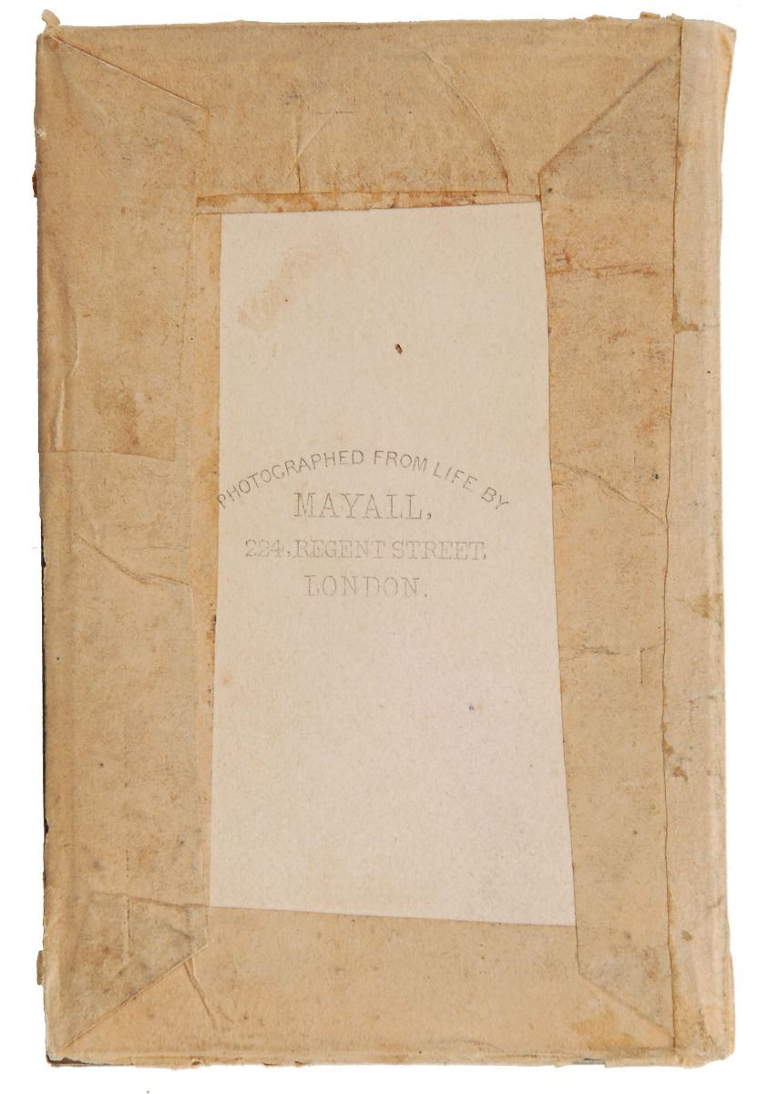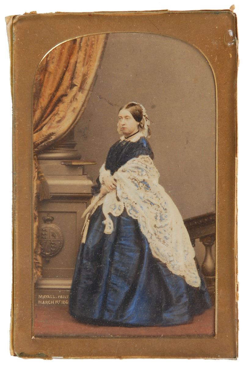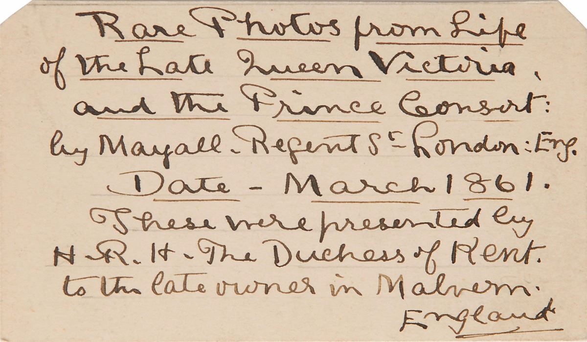 Two rare hand-colored 2.5 x 4 portraits: one of Queen Victoria by John Jabez Edwin Mayall, taken on March 1, 1861, retaining the original frame and backing, reading, “Photographed from life by Mayall, 224 Regent Street, London”; and one of Prince Albert by Camille Silvy, circa 1861, retaining the original frame and backing, reading, “Photographed by C. Silvy, 38 Porchester Terrace, Bayswater W.” In overall fine condition. Accompanied by a note, in part: “Rare photos from life of the late Queen Victoria and the Prince Consort…These were presented by H. R. H. The Duchess of Kent to the late owner in Malvern, England.”
