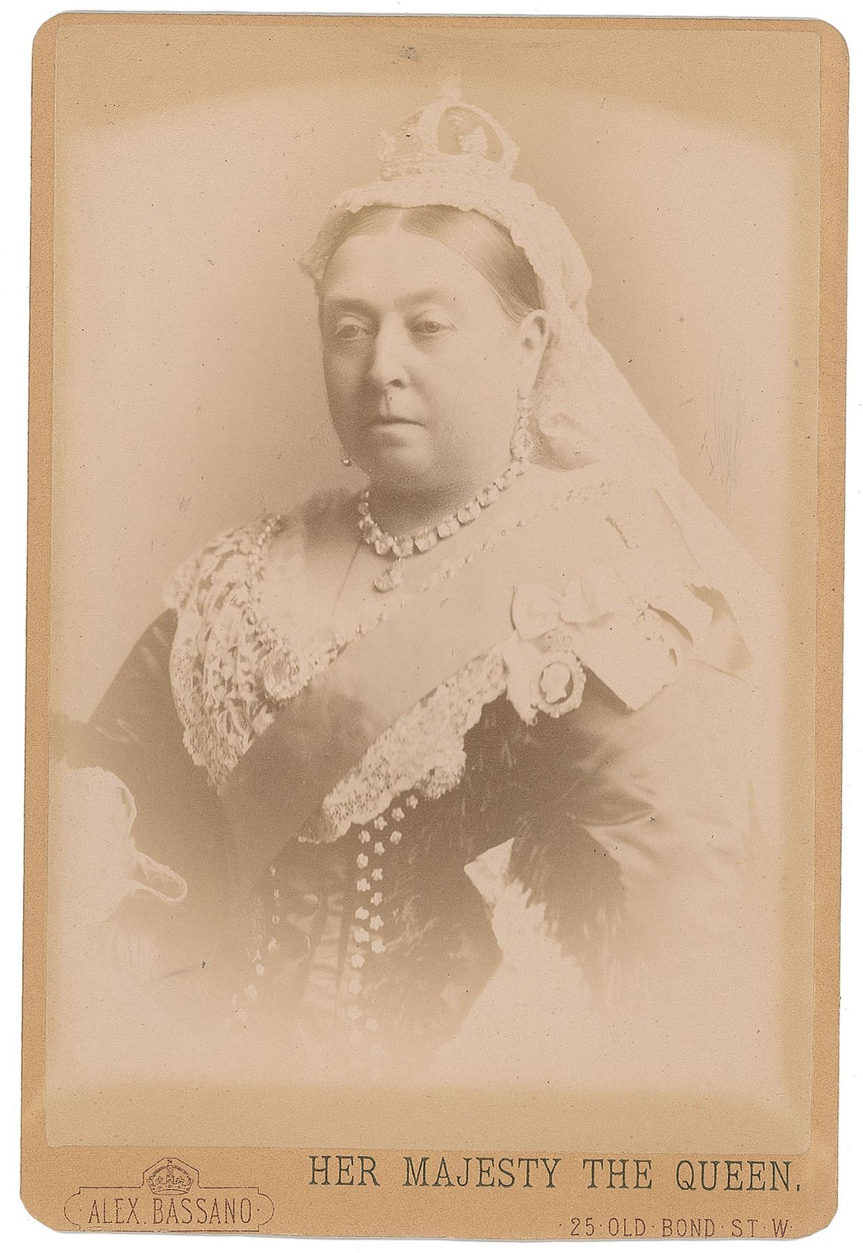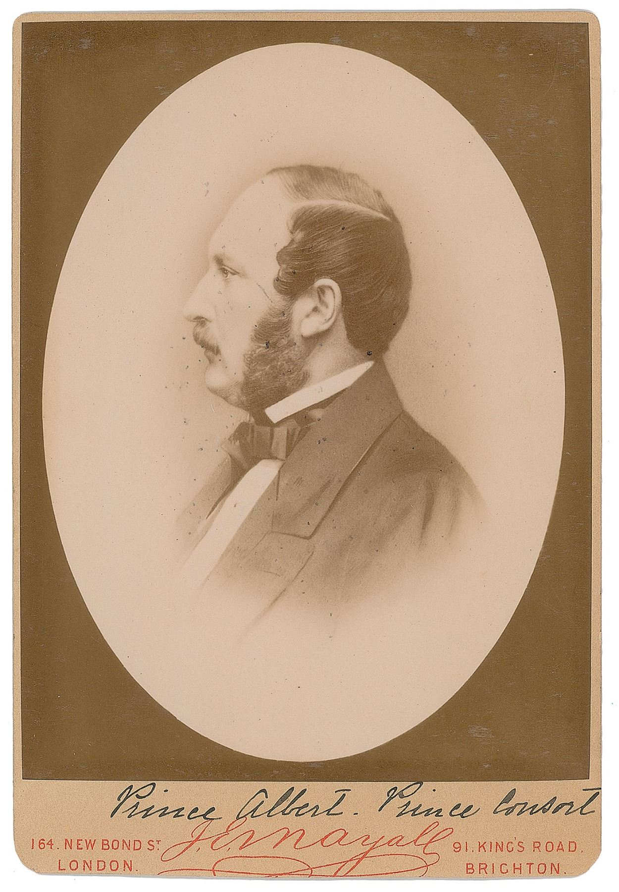 Two handsome cabinet photos: a 4.25 x 6.5 photo of Queen Victoria in a regal outfit, by Alexander Bassano of London; and a 4.25 x 6.25 photo of Prince Albert, by John Jabez Edwin Mayall of London, bearing an identification notation on the mount. In overall fine condition, with light edge toning to the Queen Victoria cabinet photo.