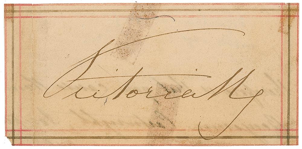 Ink signature, “Victoria R,” on an off-white 4.5 x 2 slip removed from a larger document. Vertical fold at the far left side, tear at the top fold line, uniform toning, clipped lower left corner, show-through from writing on the reverse, and staining from old tape on the reverse touching her name in two spots, otherwise very good condition.