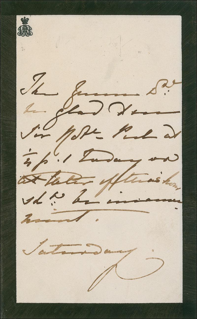 Third-person ALS, one page, 4.5 x 7, black-bordered letterhead, no date. Letter of invitation to Prime Minister Robert Peel. Peel was Prime Minister from 1841–1846 making this letter relatively early in Queen Victoria’s reign. In part: “The Queen wld. Be glad to see Sir Robt. Peel at 1/4 p. 1 today or at later…” Scattered light toning and soiling, pencil remnants to top, and thin mounting remnant to reverse of second integral page, otherwise fine condition. High-level association between two of Britain’s leading lights.
