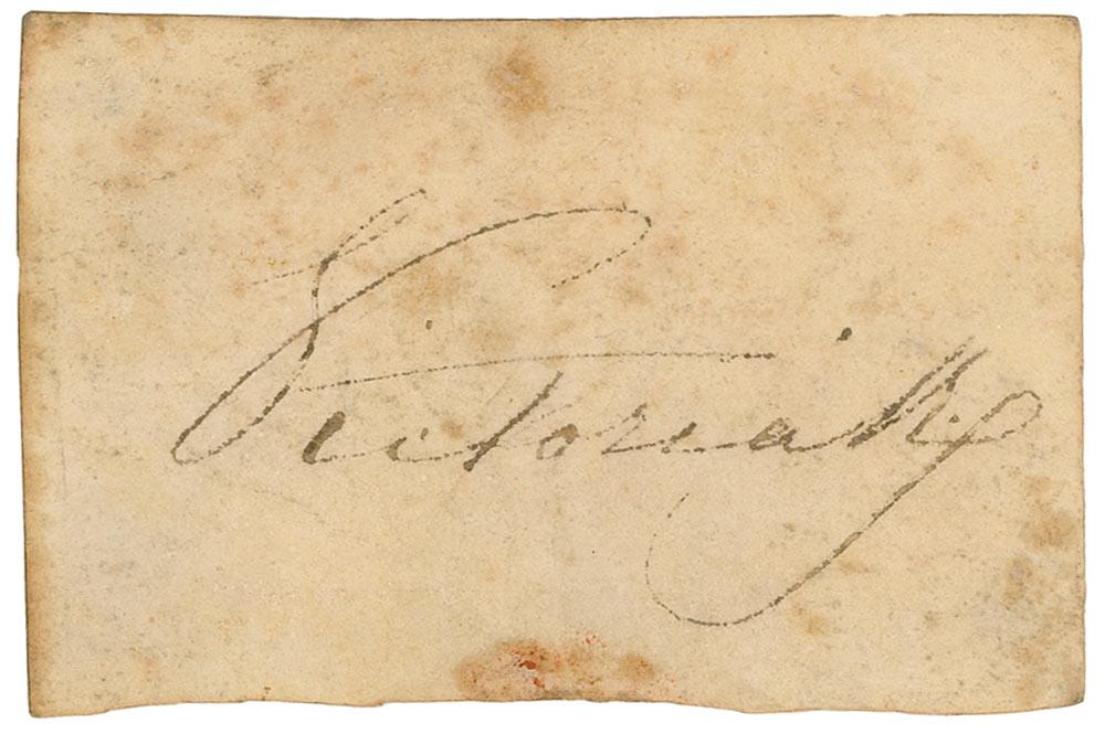 Ink signature, “Victoria R,” on an off-white 3.25 x 2 vellum slip clipped from a document. In very good condition, with scattered toning, foxing, and soiling, and some light skipping to signature.