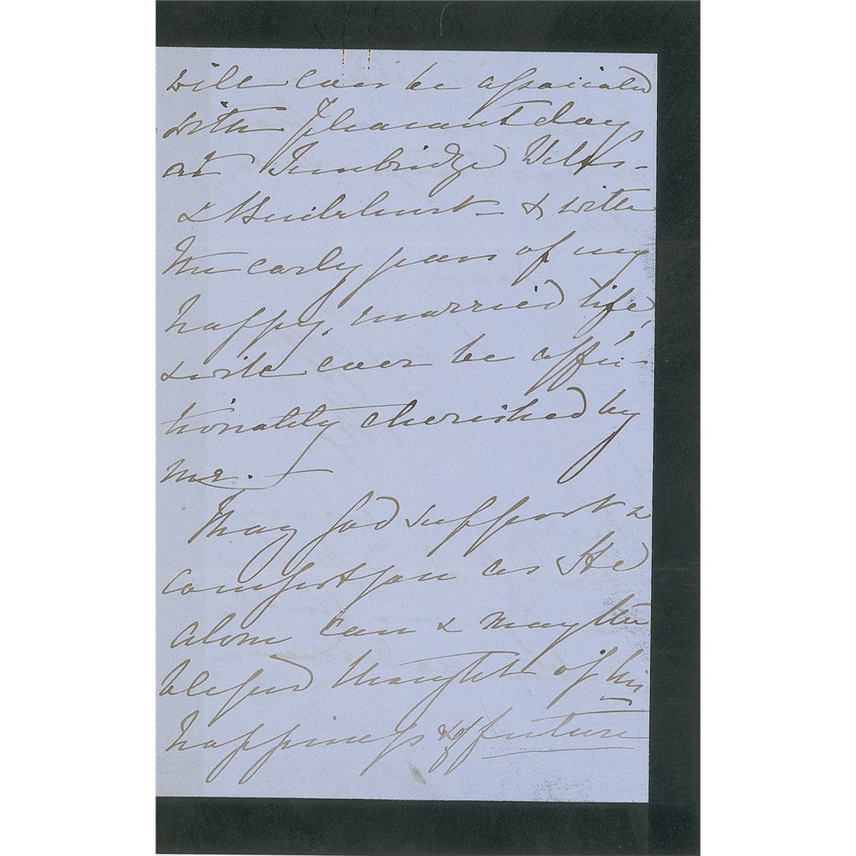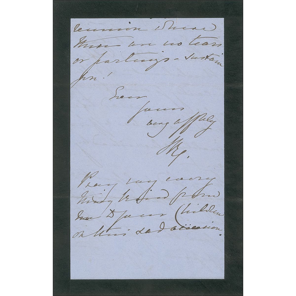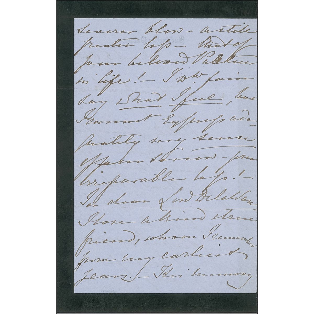 ALS signed “VR,” four pages on two adjoining sheets, 4.5 x 7, black-bordered Buckingham Palace mourning letterhead, March 5, 1869. Victoria writes to Lady De LaWare. In part: “I little thought when I wrote to you a very short while ago, that I should have to express to you my deepest, warmest & most heartfelt sympathy on a…severe blow…[and] loss—that of your beloved partner in life!… I cannot express adequately my sense of your sorrow—your irreparable loss!… May God support & comfort you as He alone can & may the blessed thought of his happiness & of the future reunion where there are now tears or partings sustain you!” Faint marginal paperclip stain to one page and slight offsetting of printed heading touching a few words of text, otherwise fine condition. Handwritten letters from any monarch are scarce, particularly with such raw and heartfelt content as the letter offered here.