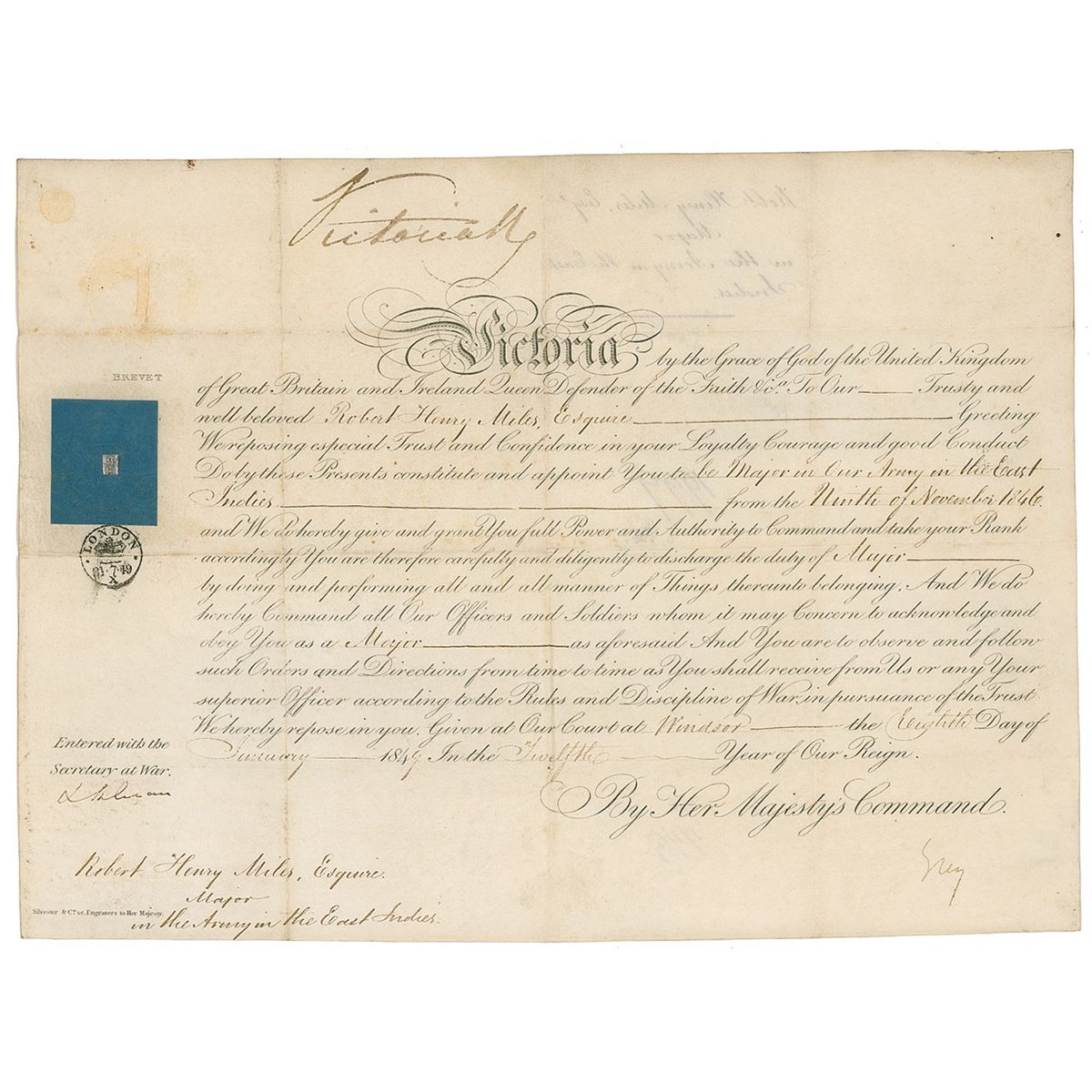 Vellum DS, signed “Victoria R.,” one page, 15.5 x 11.5, January 8, 1847. In part: “Victoria by the Grace of God of the United Kingdom of Great Britain and Ireland Queen Defender” appoints “Trusty and well beloved Robert Henry Miles, Esquire…to be Major in Our Army in the East Indies.” Signed along the top by Victoria. Intersecting folds, and scattered areas of soiling and toning, otherwise fine condition. None of the aforementioned conditions affect the crisp blue seal or the Queen’s flowing, majestic signature.