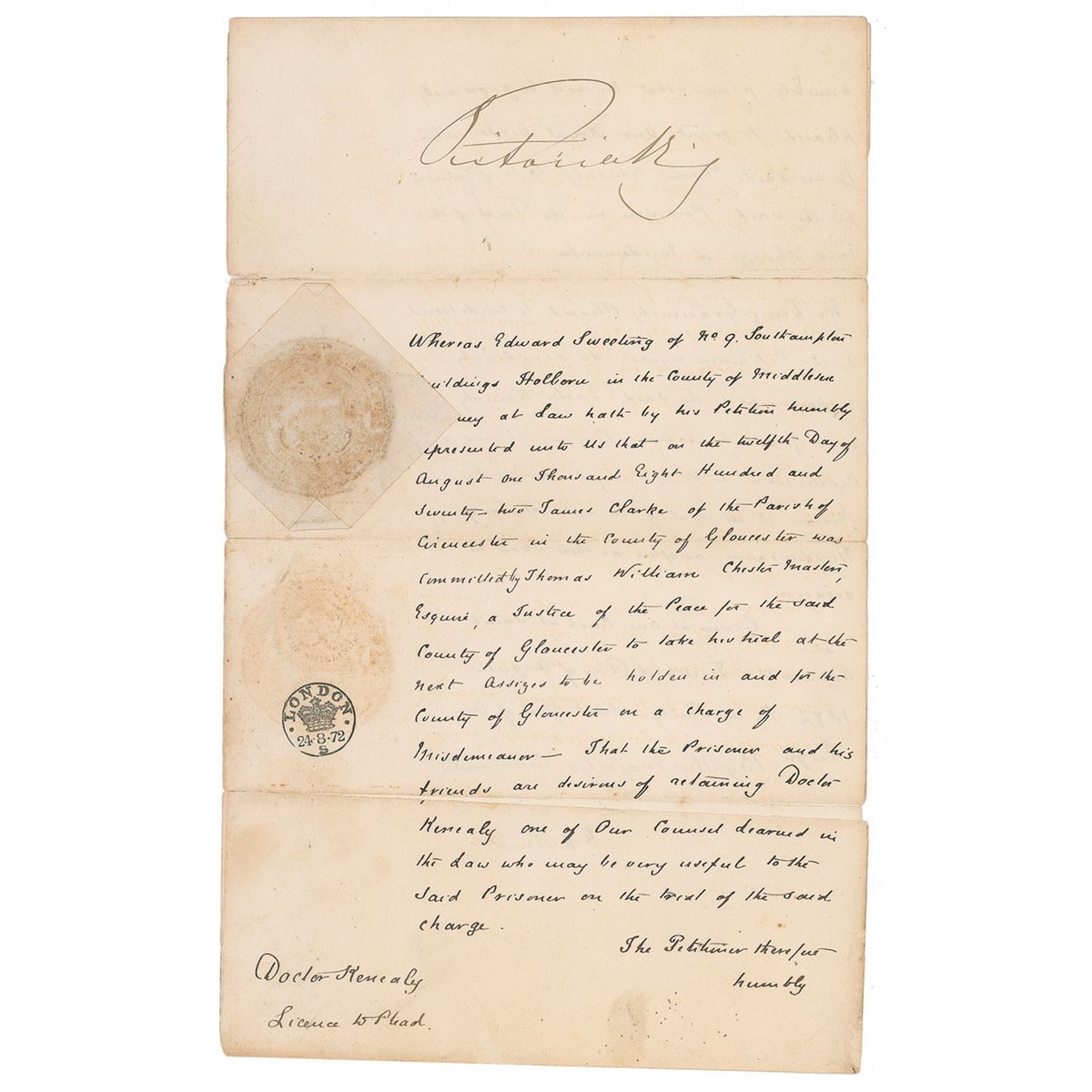 DS, signed “Victoria R,” one page both sides, 8 x 13, August 20, 1872. Document reads, in part: “Edward Sweeting…expressed unto us…James Clarke…was committed by Thomas William Chester…a Justice of the Peace…to be holden…on a charge of Misdemeanor. That the Prisoner and his friends are desirous of retaining Doctor Kenealy…who may be very useful to the said prisoner on the trial of the said charge.” The seal is intact along with an embossed ten shilling London postmark. Partial separations along fragile horizontal folds, and scattered toning and soiling, otherwise very good condition.