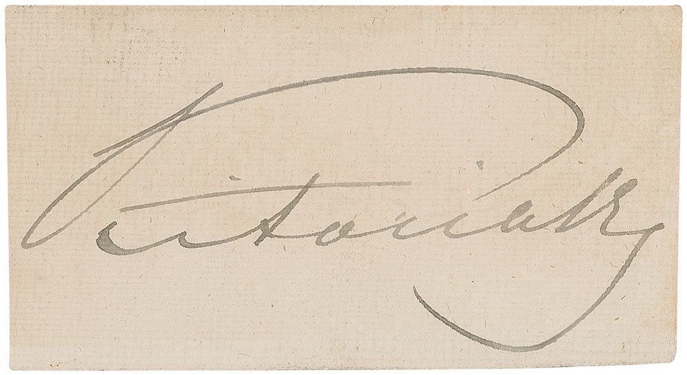Bold ink signature, “Victoria R,” on an off-white 3.5 x 2 slip. In fine condition, with some scattered light soiling and a few bends.