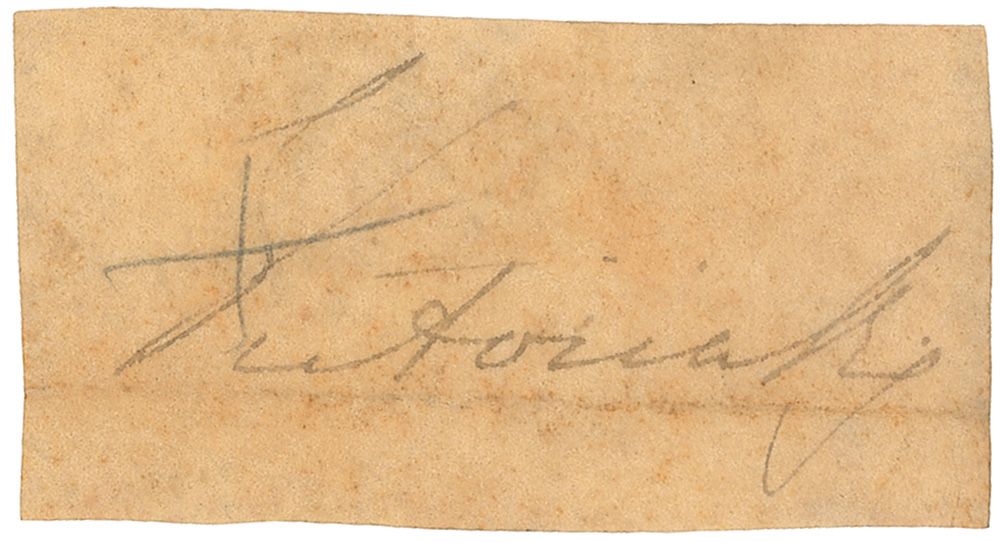 Ink signature, “Victoria R,” on an off-white 3 x 1.5 slip. In very good condition, with horizontal fold under signature, scattered toning, and signature a shade light.