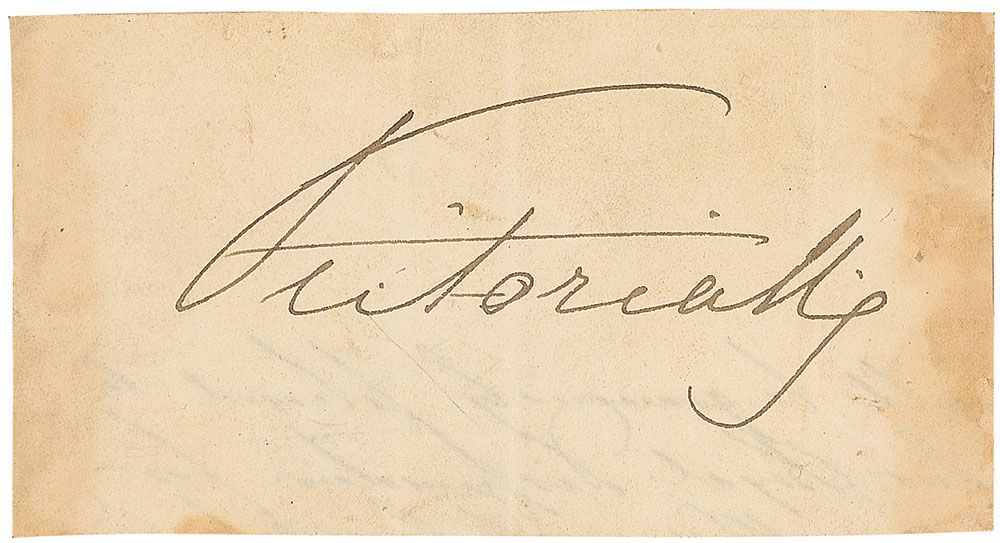 Ink signature, “Victoria R,” on an off-white 4.5 x 2.5 slip clipped from a document. Affixed to a slightly larger cardstock sheet. In very good condition, with three vertical folds passing through the signature, toning to borders, some show-through from w